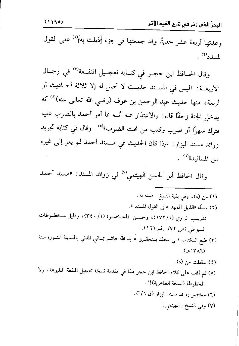 وقال الحافظ ابن حجر في كتابه تعجيل المنفعة (¬3) في رجال الأربعة: "ليس في المسند حديث لا أصل له إلا ثلاثة أحاديث أو أربعة، منها حديث عبد الرحمن بن عوف (رضي اللَّه تعالى عنه) (¬4) أنه يدخل الجنة زحفًا قال: والاعتذار عنه أنه مما أمر أحمد بالضرب عليه فترك سهوًا أو ضرب وكتب من تحت الضرب" (¬5). وقال في كتابه تجريد زوائد مسند البزار: "إذا كان الحديث في مسند أحمد لم يعز إلى غيره من المسانيد" (¬6).
