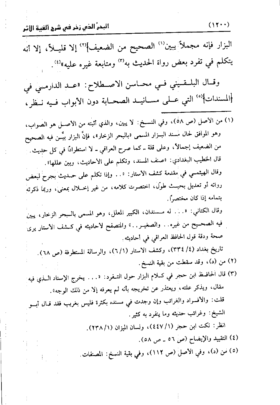(¬1) من الأصل (ص 58)، وفي النسخ: لا يبين، والذي أثبته من الأصل هو الصواب، وهو الموافق لحال مسند البزار المسمى "بالبحر الزخار"، فإنَّ البزار بيَّن فيه الصحيح من الضعيف إجمالًا، وعلى قلة -كما صرح العراقي- لا استطرادًا في كل حديث.