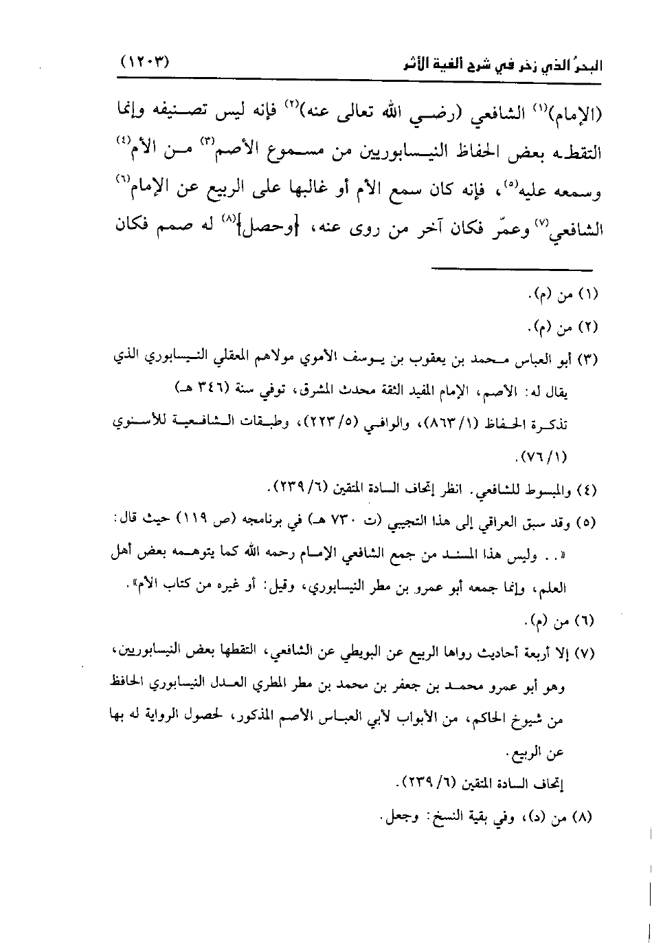 (الإمام) (¬1) الشافعي (رضي اللَّه تعالى عنه) (¬2) فإنه ليس تصنيفه وإنما التقطه بعض الحفاظ النيسابوريين من مسموع الأصم (¬3) من الأم (¬4) وسمعه عليه (¬5)، فإنه كان سمع الأم أو غالبها على الربيع عن الإمام (¬6) الشافعي (¬7) وعمّر فكان آخر من روى عنه، [وحصل] (¬8) له صمم فكان