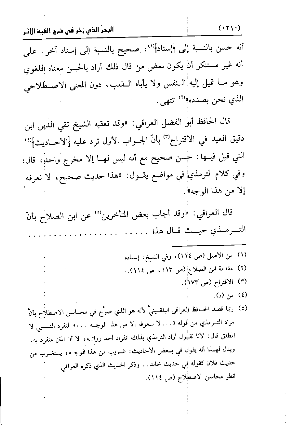 (¬5) ربما قصد الحافظ العراقي البلقينيَّ لأنه هو الذي صرَّح في محاسن الاصطلاح بأنَّ مراد الترمذي من قوله ". . . لا نعرفه إلا من هذا الوجه. . " التفرد النسبي لا المطلق قال: لأنا نقول أراد الترمذي بذلك انفراد أحد رواته، لا أن المتن منفرد به، ويدل لهذا أنه يقول في بعض الأحاديث: غريب من هذا الوجه، يستغرب من حديث فلان كقوله في حديث خالد. . وذكر الحديث الذي ذكره العراقي.