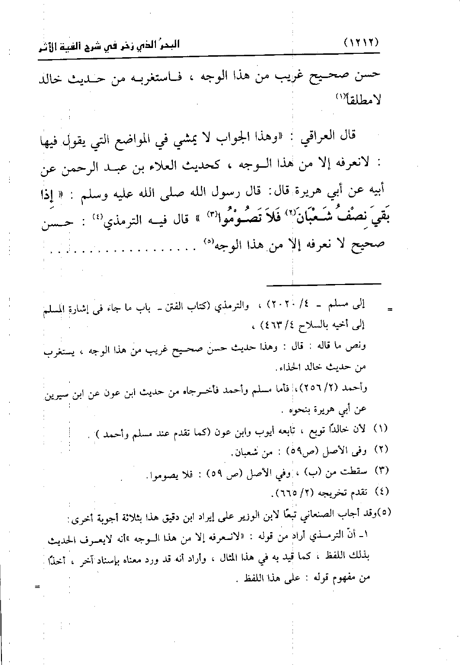 قال العراقي: "وهذا الجواب لا يمشي في المواضع التي يقول فيها: لا نعرفه إلا من هذا الوجه، كحديث العلاء بن عبد الرحمن عن أبيه عن أبي هريرة قال: قال رسول اللَّه صلى اللَّه عليه وسلم: "إِذا بَقيَ نِصْفُ شَعْبَانَ (¬2) فَلَا تَصُوْمُوا (¬3) " قال فيه الترمذي (¬4): حسن صحيح لا نعرفه إلا من هذا الوجه (¬5). . . . .