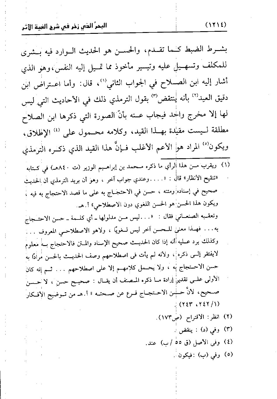 (¬1) ويقرب من هذا الرأي ما ذكره محمد بن إبراهيم الوزير (ت 840 هـ) في كتابه "تنقيح الأنظار" قال: ". . . وعدي جواب آخر، وهو أن يريد الترمذي أن الحديث صحيح في إسناده ومتنه، حسن في الاحتجاج به على ما قصد الاحتجاج به فيه، ويكون هذا الحسن هو الحسن اللغوي دون الاصطلاحي" أ. هـ.