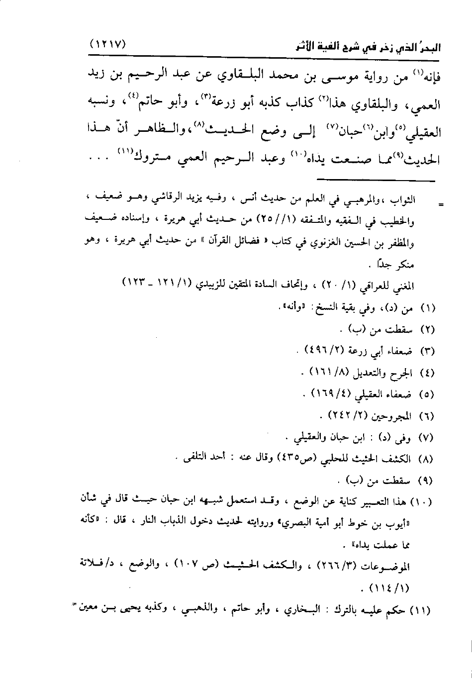 فإنه (¬1) من رواية موسى بن محمد البلقاوي عن عبد الرحيم بن زيد العمي، والبلقاوي هذا (¬2) كذاب كذبه أبو زرعة (¬3)، وأبو حاتم (¬4)، ونسبه العقيلي (¬5) وابن (¬6) حبان (¬7) إلى وضع الحديث (¬8)، والظاهر أنَّ هذا الحديث (¬9) مما صنعت يداه (¬10) وعبد الرحيم العمي متروك (¬11). . .