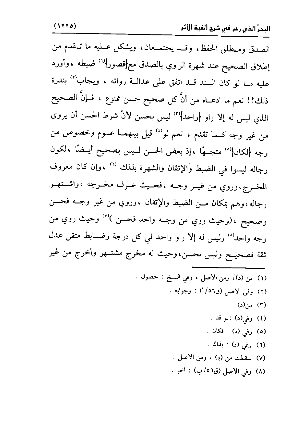 الصدق ومطلق الحفظ، وقد يجتمعان، ويشكل عليه ما تقدم من إطلاق الصحيح عند شهرة الراوي بالصدق مع [قصور] (¬1) ضبطه، وأورد عليه ما لو كان السند قد اتفق على عدالة رواته، ويجاب (¬2) بندرة ذلك! ! نعم ما ادعاه من أنَّ كل صحيح حسن ممنوع، فإنَّ الصحيح الذي ليس له إلا راو [واحد] (¬3) ليس بحسن لأنّ شرط الحسن أن يروى من غير وجه كما تقدم، نعم لو (¬4) قيل بينهما عموم وخصوص من وجه [لكان] (¬5) متجهًا، إذ بعض الحسن ليس بصحيح أيضًا، لكون رجاله ليسوا في الضبط والإتقان والهرة بذلك (¬6)، وإن كان معروف المخرج، وروي من غير وجه، فحيث عرف مخرجه، واشتهر رجاله، وهم بمكان من الضبط والإتقان، وروي من غير وجه فحسن وصحيح، (وحيث روي من وجه واحد فحسن) (¬7) وحيث روي من وجه واحد (¬8) وليس له إلا راو واحد في كل درجة وضابط متقن عدل ثقة فصحيح وليس بحسن، وحيث له مخرج مشتهر وأخرج من غير