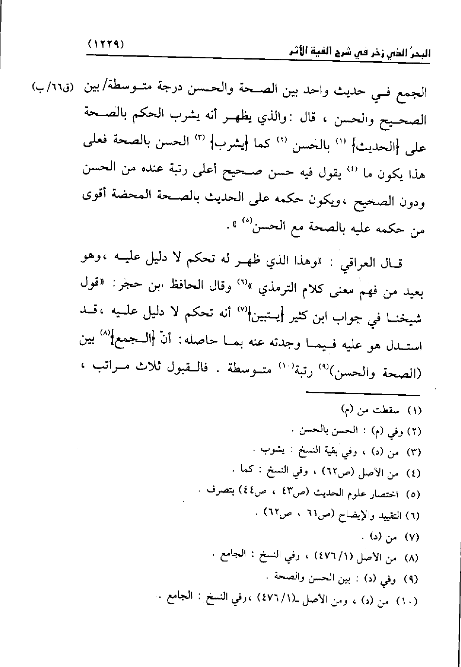 قال العراقي: "وهذا الذى ظهر له تحكم لا دليل عليه، وهو بعيد من فهم معنى كلام الترمذي" (¬6) وقال الحافظ ابن حجر: "قول شيخنا في جواب ابن كثير [يتبين] (¬7) أنه تحكم لا دليل عليه، قد استدل هو عليه فيما وجدته عنه بما حاصله: أنّ [الجمع] (¬8) بين (الصحة والحسن) (¬9) رتبة (¬10) متوسطة. فالقبول ثلاث مرات،