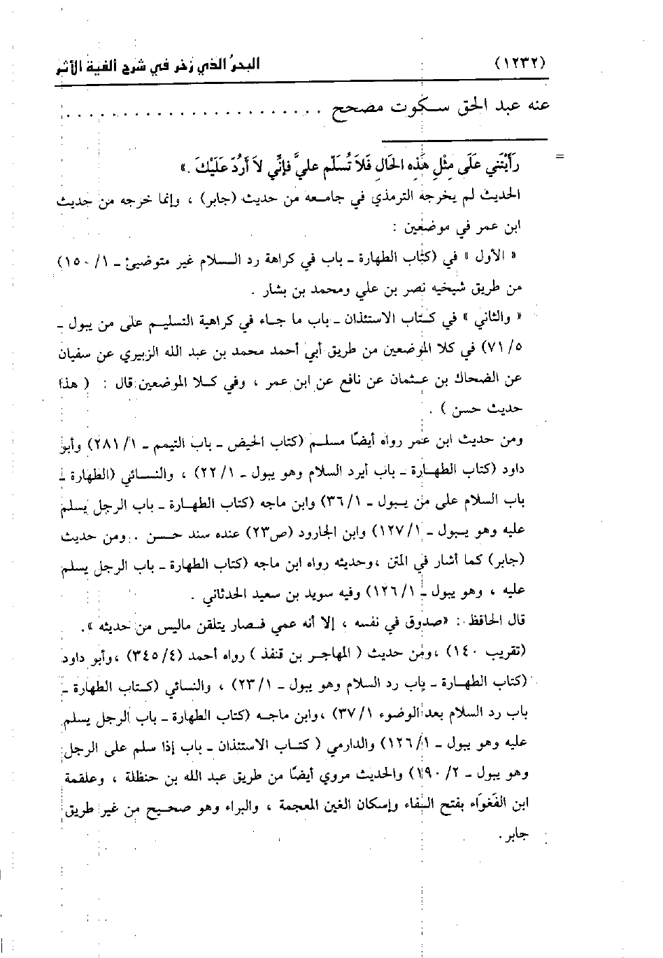 (تقريب 140)، ومن حديث (المهاجر بن قنفذ) رواه أحمد (4/ 345)، وأبو داود (كتاب الطهارة - باب رد السلام وهو يبول - 1/ 23)، والنسائي (كتاب الطهارة - باب رد السلام بعد الوضوء 1/ 37)، وابن ماجه (كتاب الطهارة - باب الرجل يسلم عليه وهو يبول - 1/ 126) والدارمي (كتاب الاستئذان - باب إذا سلم على الرجل وهو يبول - 2/ 190) والحديث مروي أيضًا من طريق عبد اللَّه بن حنظلة، وعلقمة ابن الفَغوَاء بفتح الفاء وإسكان الغين المعجمة، والبراء وهو صحيح من غير طريق جابر.