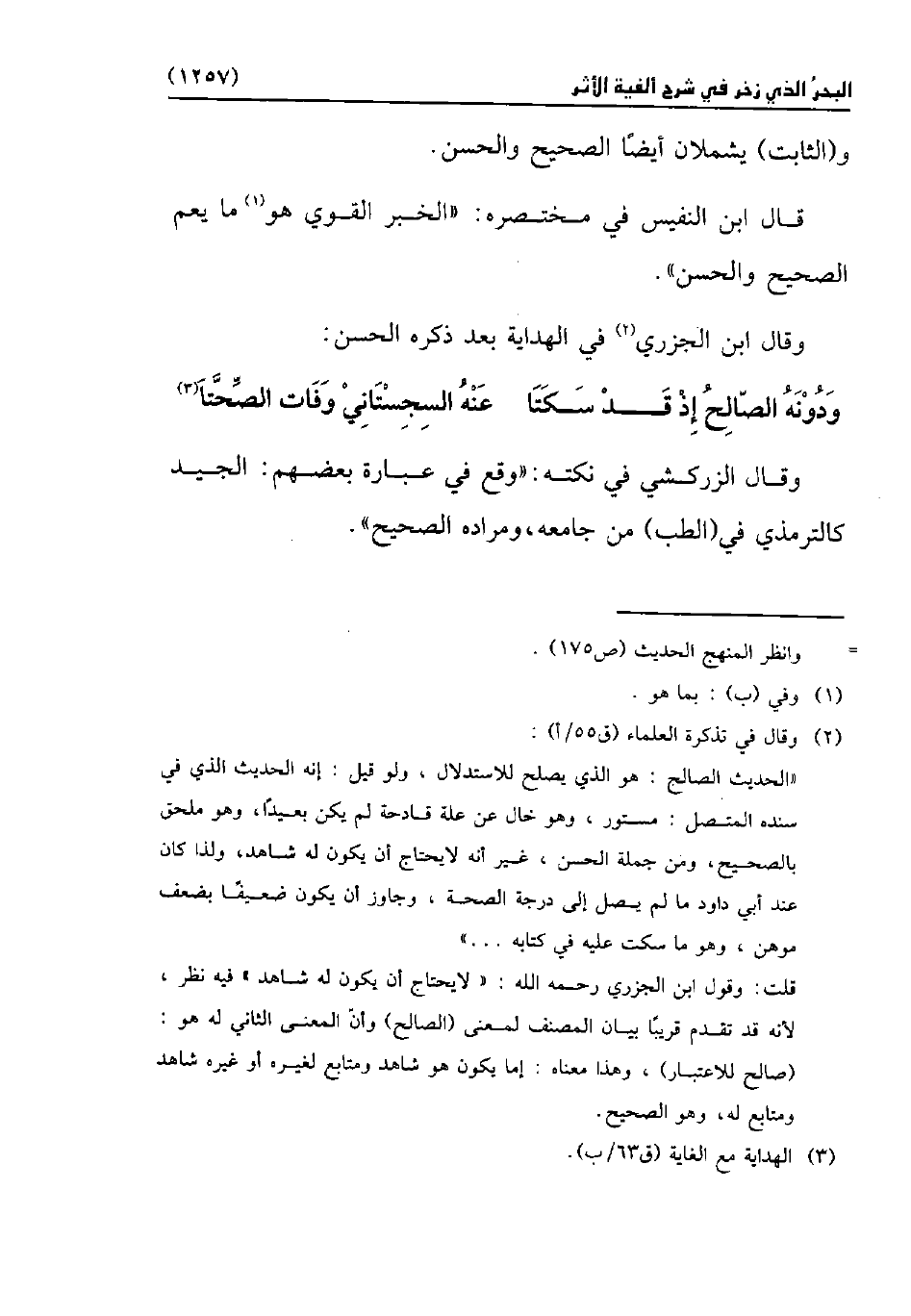 قلت: وقول ابن الجزري رحمه اللَّه: "لا يحتاج أن يكون له شاهدا فيه نظر، لأنه قد تقدم قريبًا بيان المصنف لمعنى (الصالح) وأن المعنى الثاني له هو: (صالح للاعتبار)، وهذا معناه: إما يكون هو شاهد ومتابع لغيره أو غيره شاهد ومتابع له، وهو الصحيح.