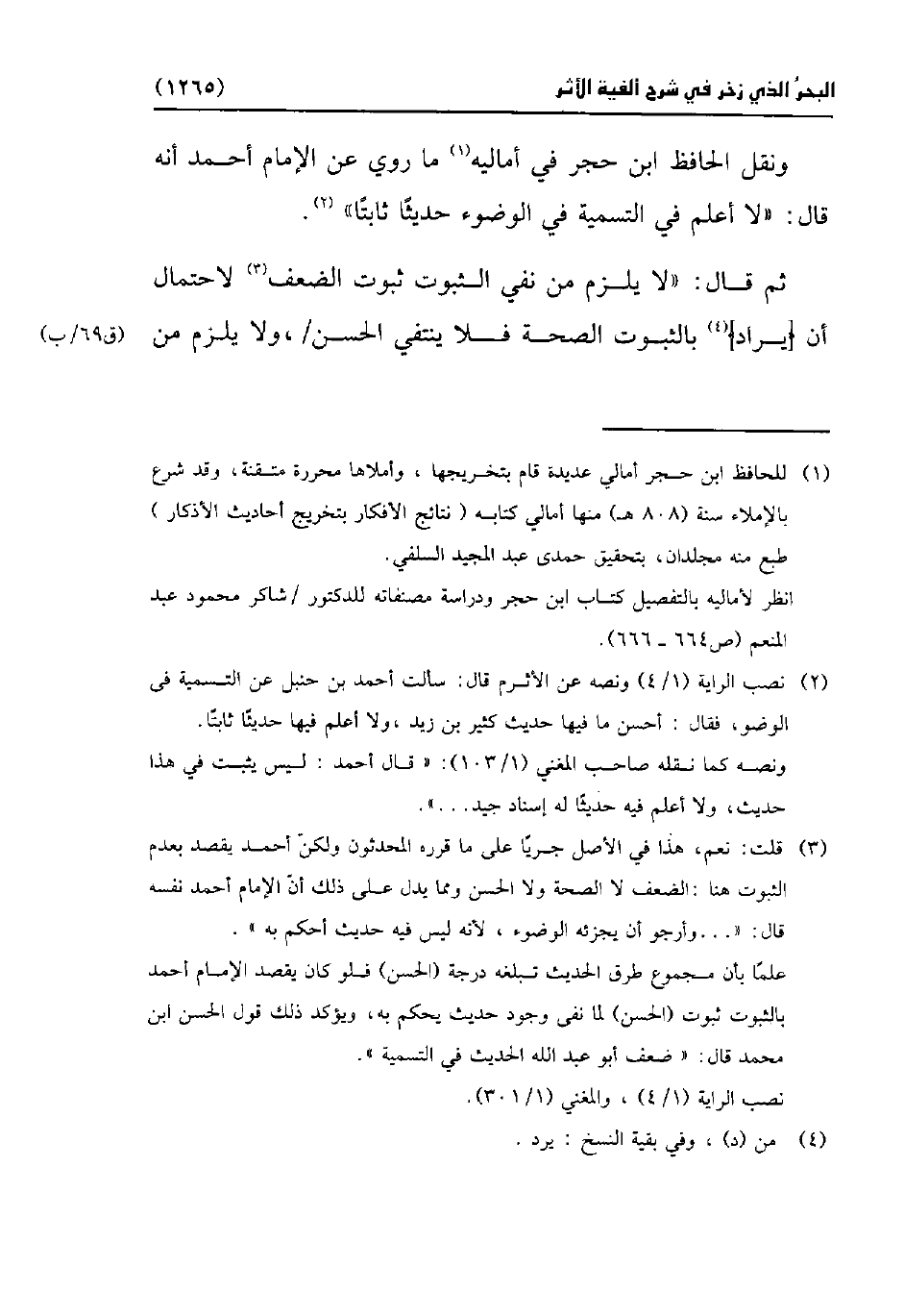 (¬2) نص الراية (1/ 4) ونصه عن الأثرم قال: سألت أحمد بن حنبل عن التسمية في الوضوء فقال: أحسن ما فيها حديث كثير بن زيد، ولا أعلم فيها حديثًا ثابتًا.