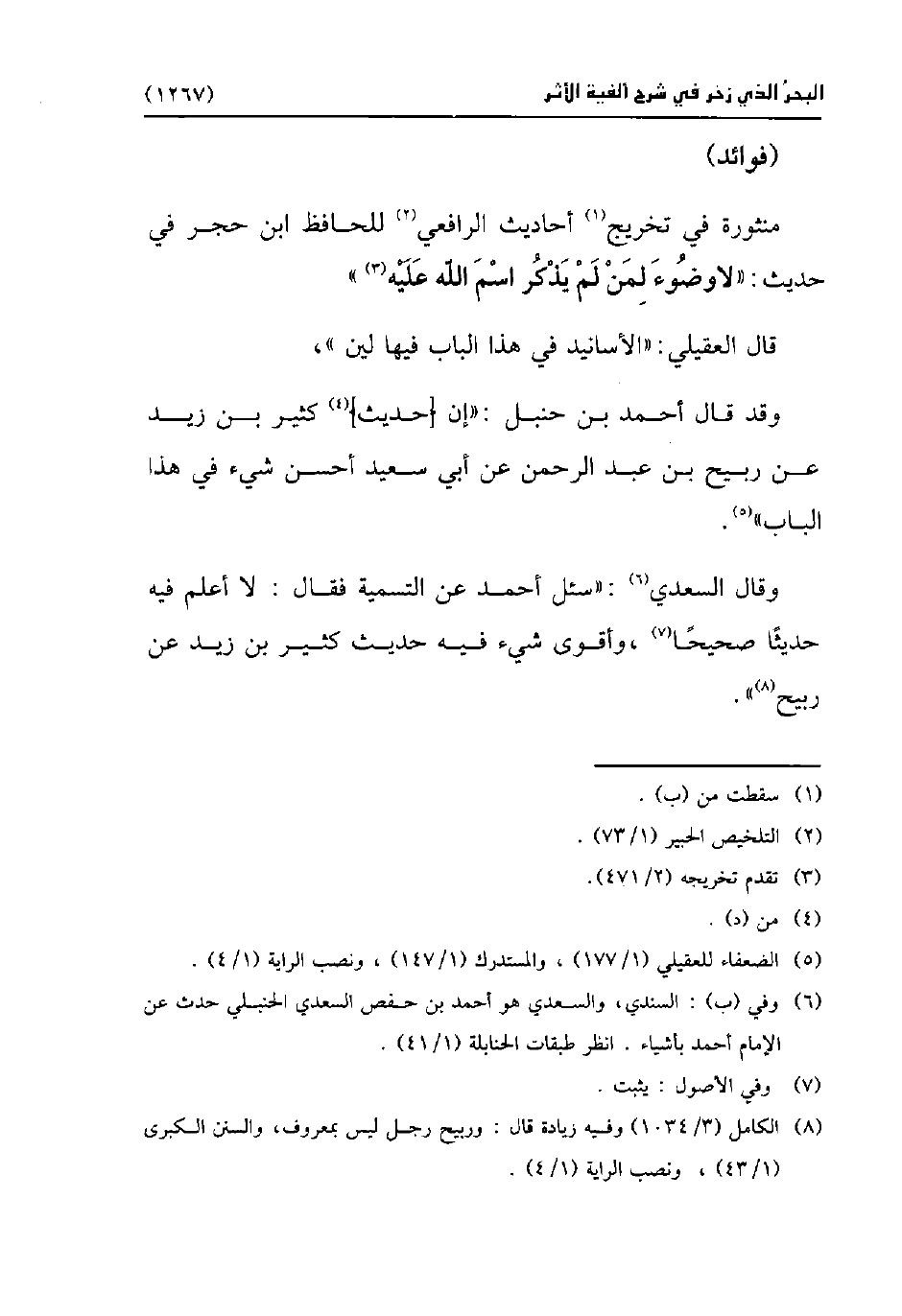 منثورة في تخريج (¬1) أحاديث الرافعي (¬2) للحافظ ابن حجر في حديث: "لا وضُوءَ لِمَنْ لَمْ يَذْكُر اسمَ اللَّه عَلَيْه (¬3) ".