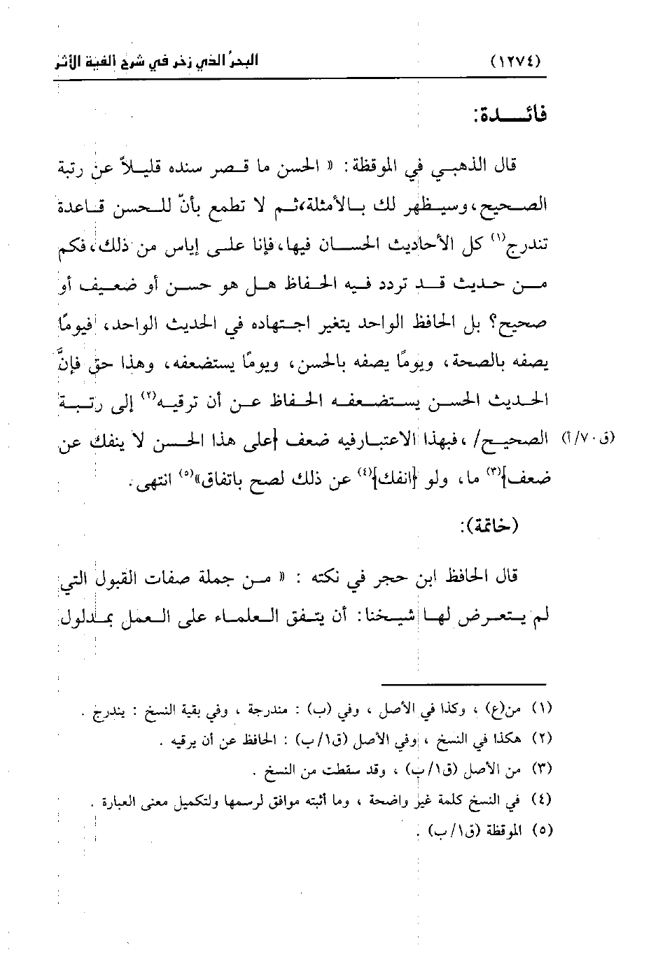 قال الذهبي في الموقظة: "الحسن ما قصر سده قليلًا عن رتبة الصحيح، وسيظهر لك بالأمثلة، ثم لا تطمع بأنّ للحسن قاعدة تندرج (¬1) كل الأحاديث الحسان فيها، فإنا على إياس من ذلك، فكم من حديث قد تردد فيما الحفاظ هل هو حسن أو ضعيف أو صحيح؟ بل الحافظ الواحد يتغير اجتهاده في الحديث الواحد، فيومًا يصفه بالصحة، ويومًا يصفه بالحسن، ويومًا يستضعفه، وهذا حق فإن الحديث الحسن يستضعفه الحفاظ عن أن ترقيه (¬2) إلى رتبة الصحيح، فبهذا الاعتبار فيه ضعف [على هذا الحسن لا ينفك عن ضعف] (¬3) ما، ولو [انفك] (¬4) عن ذلك لصح باتفاق" (¬5) انتهى.