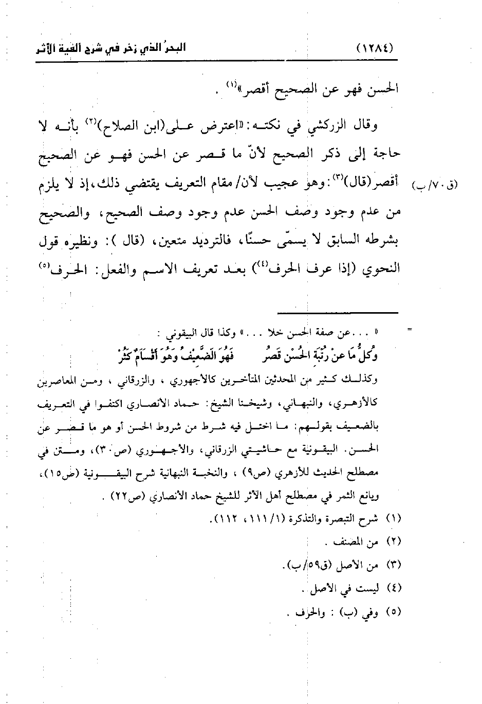 وقال الزركشي في نكته: "اعترض على (ابن الصلاح) (¬2) بأنه لا حاجة إلى ذكر الصحيح لأنّ ما قصر عن الحسن فهو عن الصحيح أقصر (قال) (¬3): وهو عجيب لأن مقام التعريف يقتضي ذلك، إذ لا يلزم من عدم وجود وصف الحسن عدم وجود وصف الصحيح، والصحيح بشرطه السابق لا يسمّى حسنًا، فالترديد متعين، (قال): ونظيره قول النحوى (إذا عرف الحرف) (¬4) بعد تعريف الاسم والفعل: الحرف (¬5)