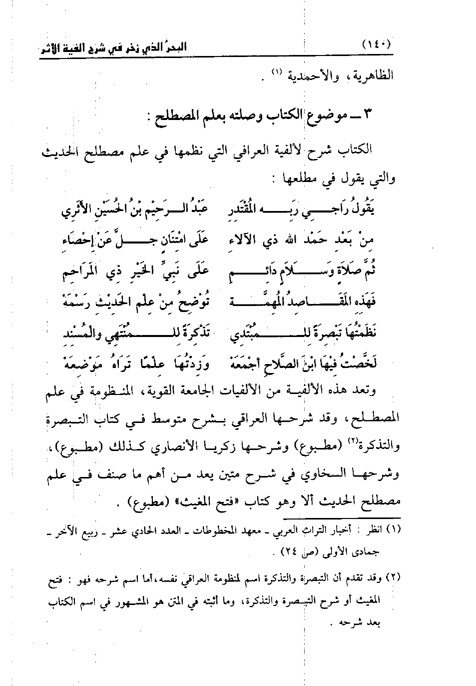 (¬2) وقد تقدم أن التبصرة والتذكرة اسم لمنظومة العراقي نفسه، أما اسم شرحه فهو: فتح المغيث أو شرح التبصرة والتذكرة، وما أثبته في المتن هو المشهور في اسم الكتاب بعد شرحه.