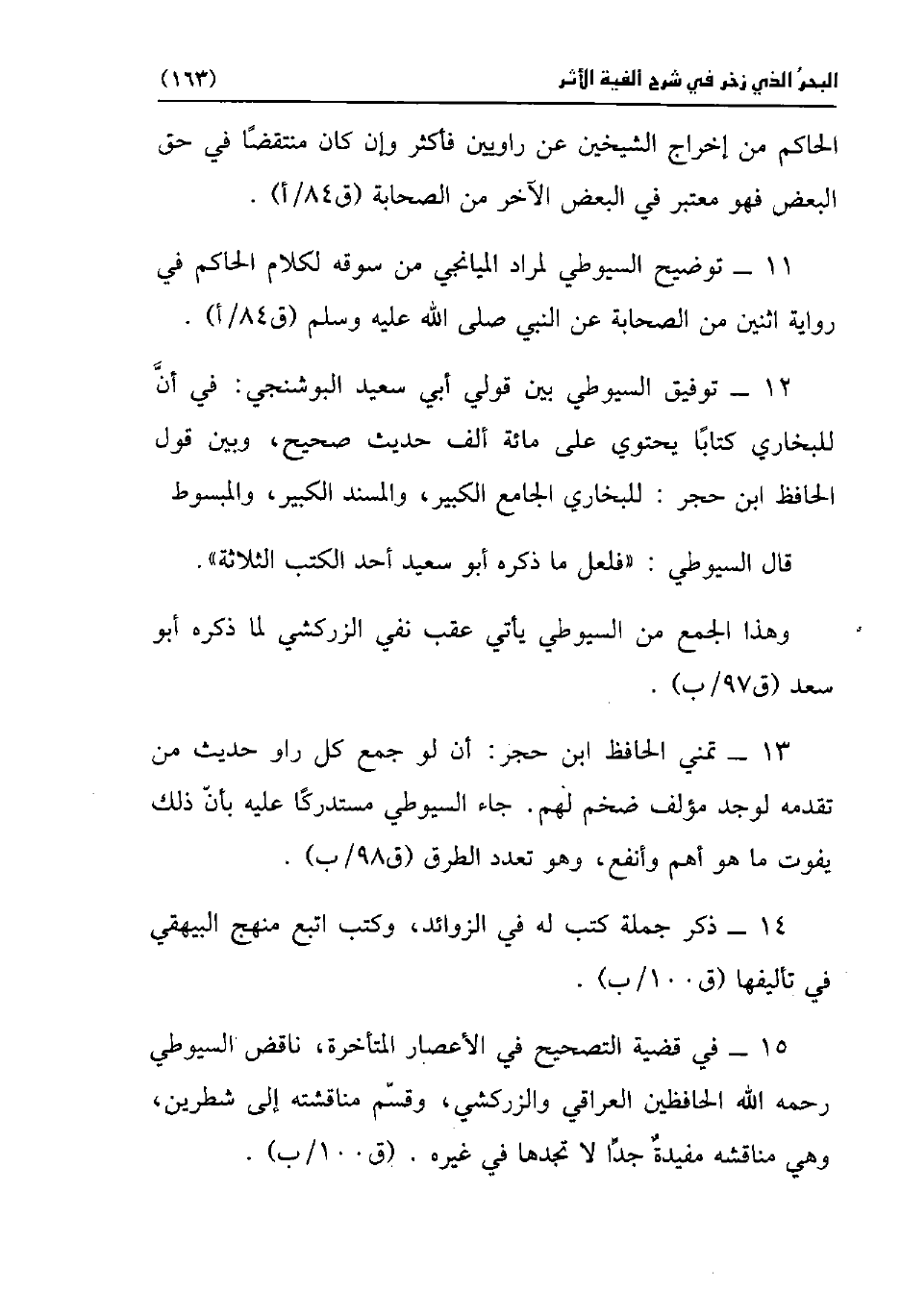 15 - في قضية التصحيح في الأعصار المتأخرة، ناقض السيوطي رحمه اللَّه الحافظين العراقي والزركشي، وقسّم مناقشته إلى شطرين، وهي مناقشه مفيدة جدًّا لا تجدها في غيره. (ق 100/ ب).
