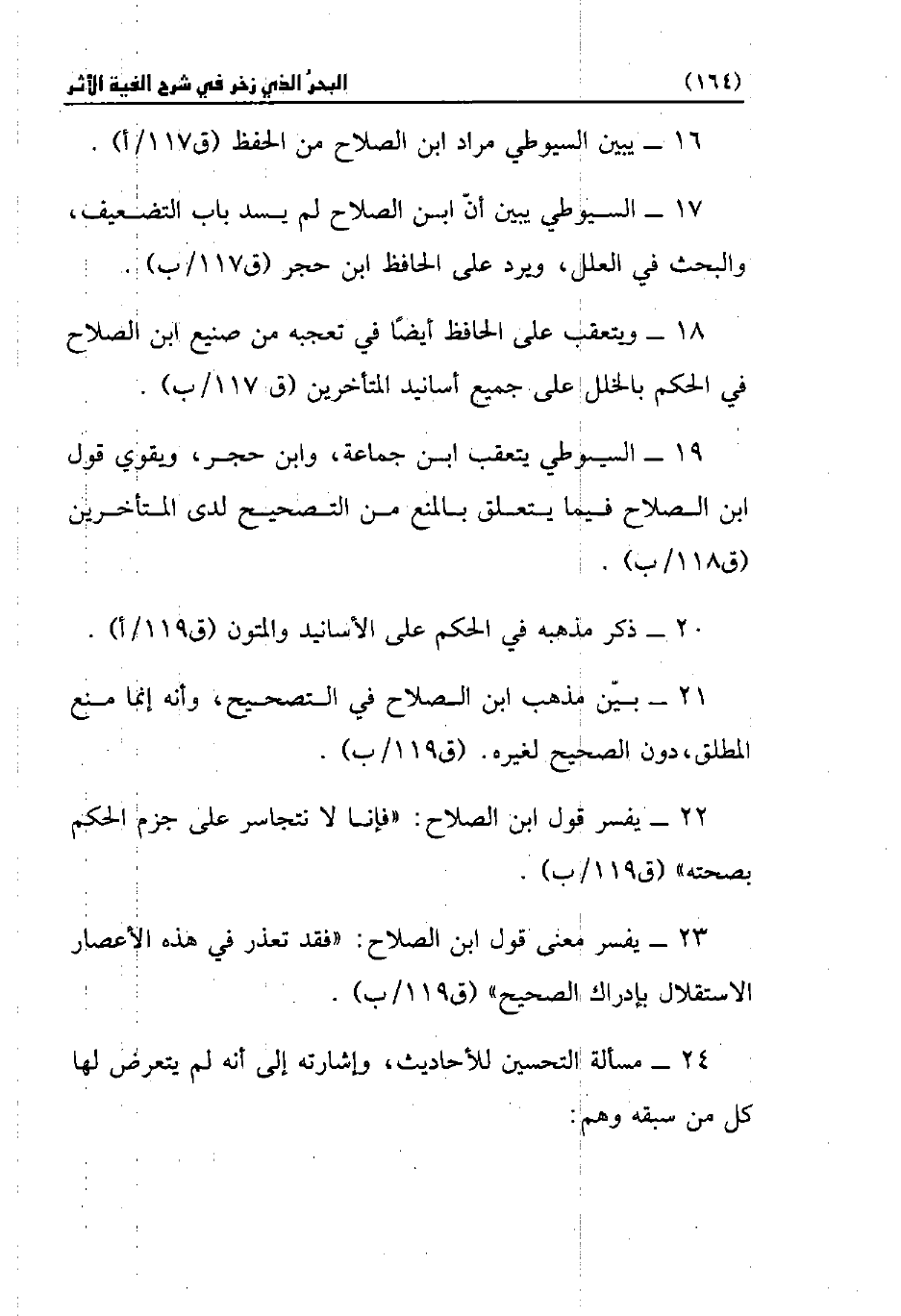 17 - السيوطي يبين أنّ ابن الصلاح لم يسد باب التضعيف، والبحث في العلل، ويرد على الحافظ ابن حجر (ق 117/ ب).