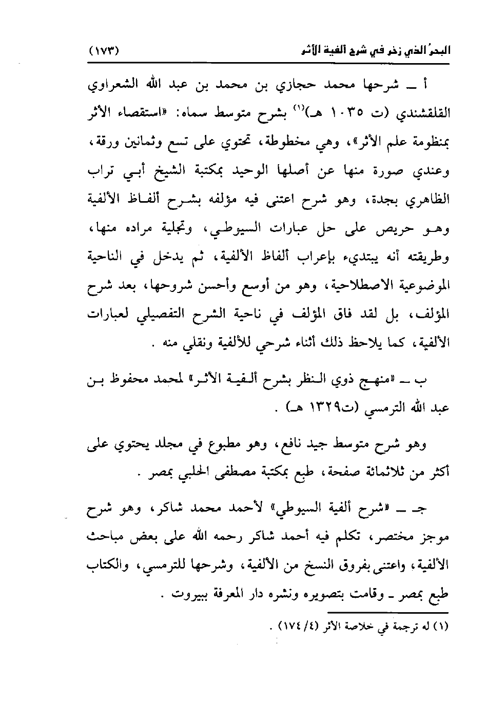 أ- شرحها محمد حجازي بن محمد بن عبد اللَّه الشعراوي القلقشندي (ت 1035 هـ) (¬1) بشرح متوسط سماه: "استقصاء الأثر بمنظومة علم الأثر"، وهي مخطوطة، تحتوي على تسع وثمانين ورقة، وعندي صورة منها عن أصلها الوحيد بمكتبة الشيخ أبي تراب الظاهري بجدة، وهو شرح اعتنى فيه مؤلفه بشرح ألفاظ الألفية وهو حريص على حل عبارات السيوطي، وتجلية مراده منها، وطريقته أنه يبتديء بإعراب ألفاظ الألفية، ثم يدخل في الناحية الموضوعية الاصطلاحية، وهو من أوسع وأحسن شروحها، بعد شرح المؤلف، بل لقد فاق المؤلف في ناحية الشرح التفصيلي لعبارات الألفية، كما يلاحظ ذلك أثناء شرحي للألفية ونقلي منه.
