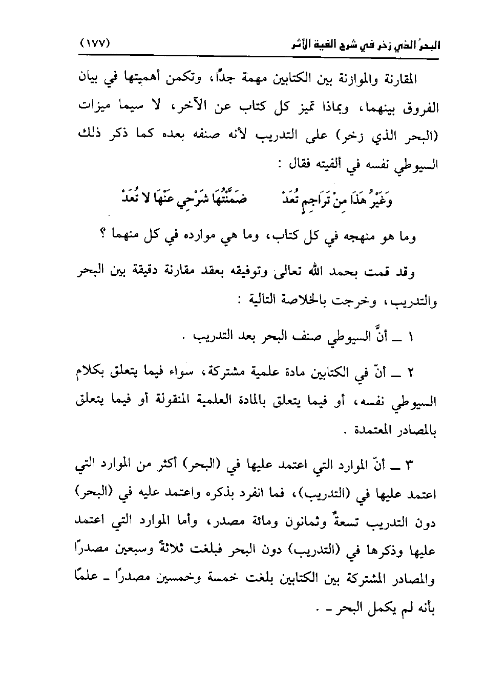 3 - أنّ الموارد التي اعتمد عليها في (البحر) أكثر من الموارد التي اعتمد عليها في (التدريب)، فما انفرد بذكره واعتمد عليه في (البحر) دون التدريب تسعةٌ وثمانون ومائة مصدر، وأما الموارد التي اعتمد عليها وذكرها في (التدريب) دون البحر فبلغت ثلاثةً وسبعين مصدرًا والمصادر المشتركة بين الكتابين بلغت خمسة وخمسين مصدرًا -علمًا بأنه لم يكمل البحر-.