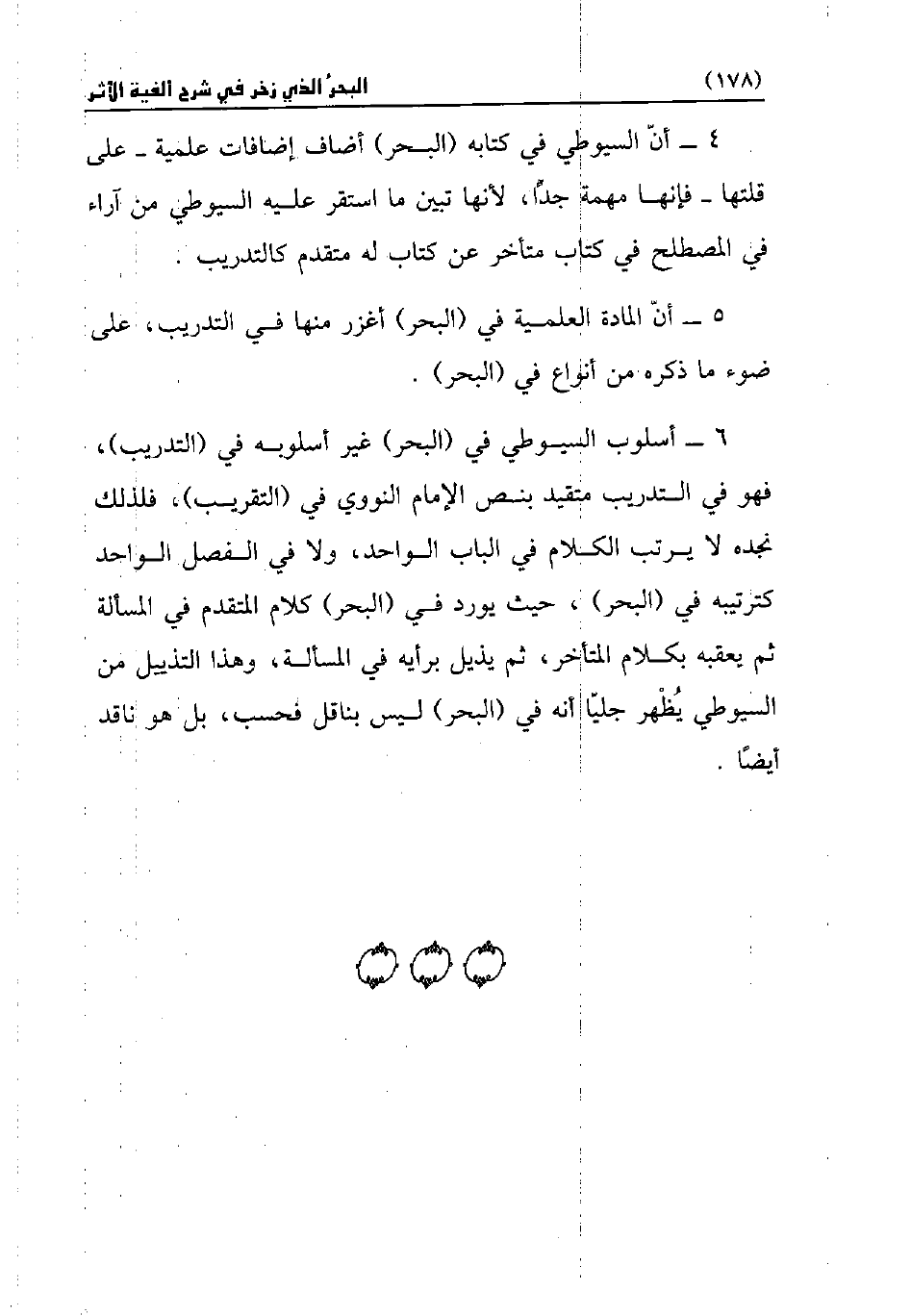 6 - أسلوب السيوطي في (البحر) غير أسلوبه في (التدريب)، فهو في التدرب متقيد بنص الإمام النووي في (التقريب)، فلذلك نجده لا يرتب الكلام في الباب الواحد، ولا في الفصل الواحد كترتيبه في (البحر)، حيث يورد في (البحر) كلام المتقدم في المسألة ثم يعقبه بكلام المتأخر، ثم يذيل برأيه في المسألة، وهذا التذييل من السيوطي يُظهر جليّا أنه في (البحر) ليس بناقل فحسب، بل هو ناقد أيضًا.