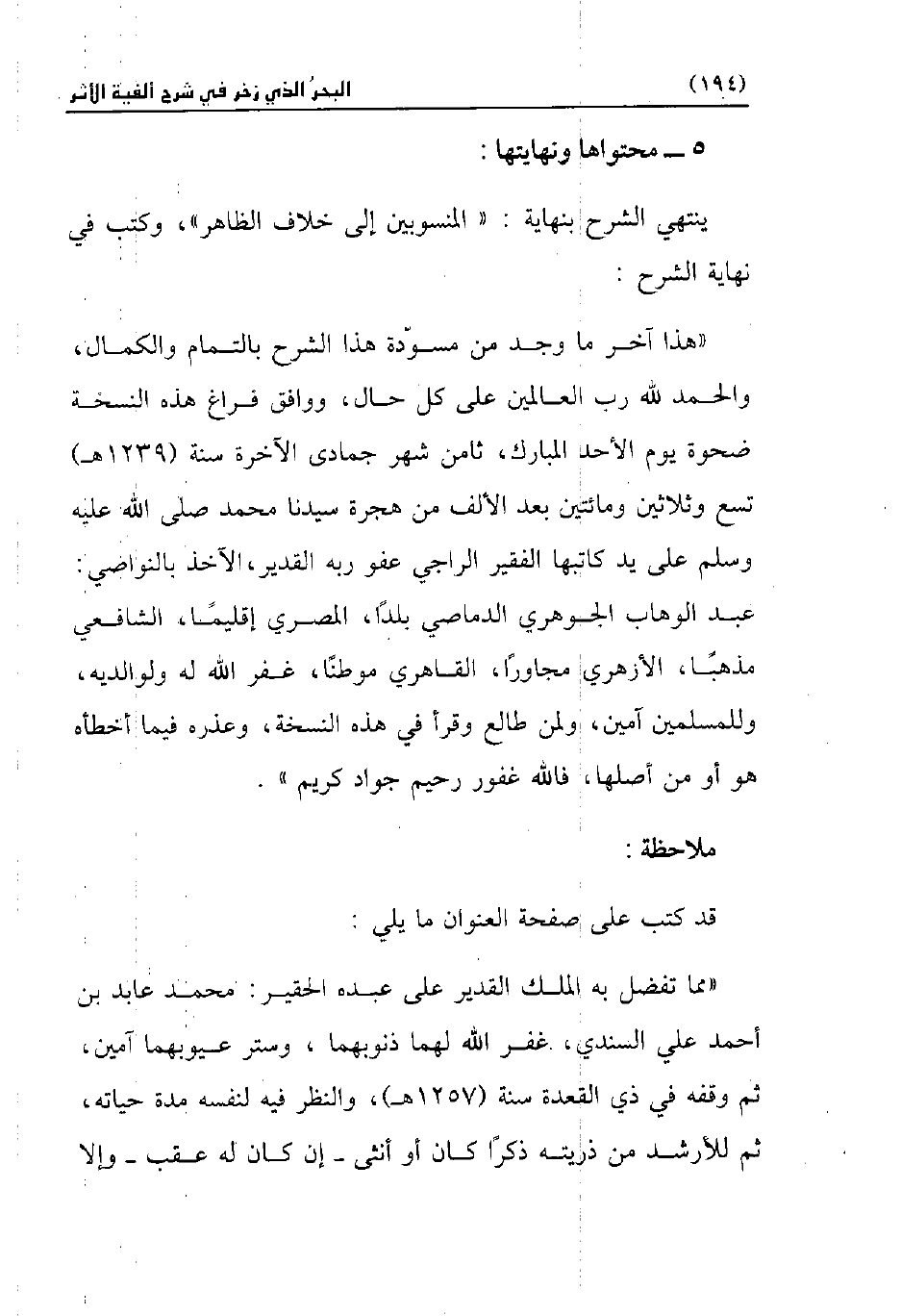"هذا آخر ما وجد من مسوّدة هذا الشرح بالتمام والكمال، والحمد للَّه رب العالمين على كل حال، ووافق فراغ هذه النسخة ضحوة يوم الأحد المبارك، ثامن شهر جمادى الآخرة سنة (1239 هـ) تسع وثلاثين ومائتين بعد الألف من هجرة سيدنا محمد صلى اللَّه عليه وسلم على يد كاتبها الفقير الراجي عفو ربه القدير، الآخذ بالنواصي: عبد الوهاب الجوهري الدماصي بلدًا، المصري إقليمًا، الشافعي مذهبًا، الأزهري مجاورًا، القاهري موطنًا، غفر اللَّه له ولوالديه، وللمسلمين آمين، ولمن طالع وقرأ في هذه النسخة، وعذره فيما أخطأه هو أو من أصلها، فاللَّه غفور رحيم جواد كريم".