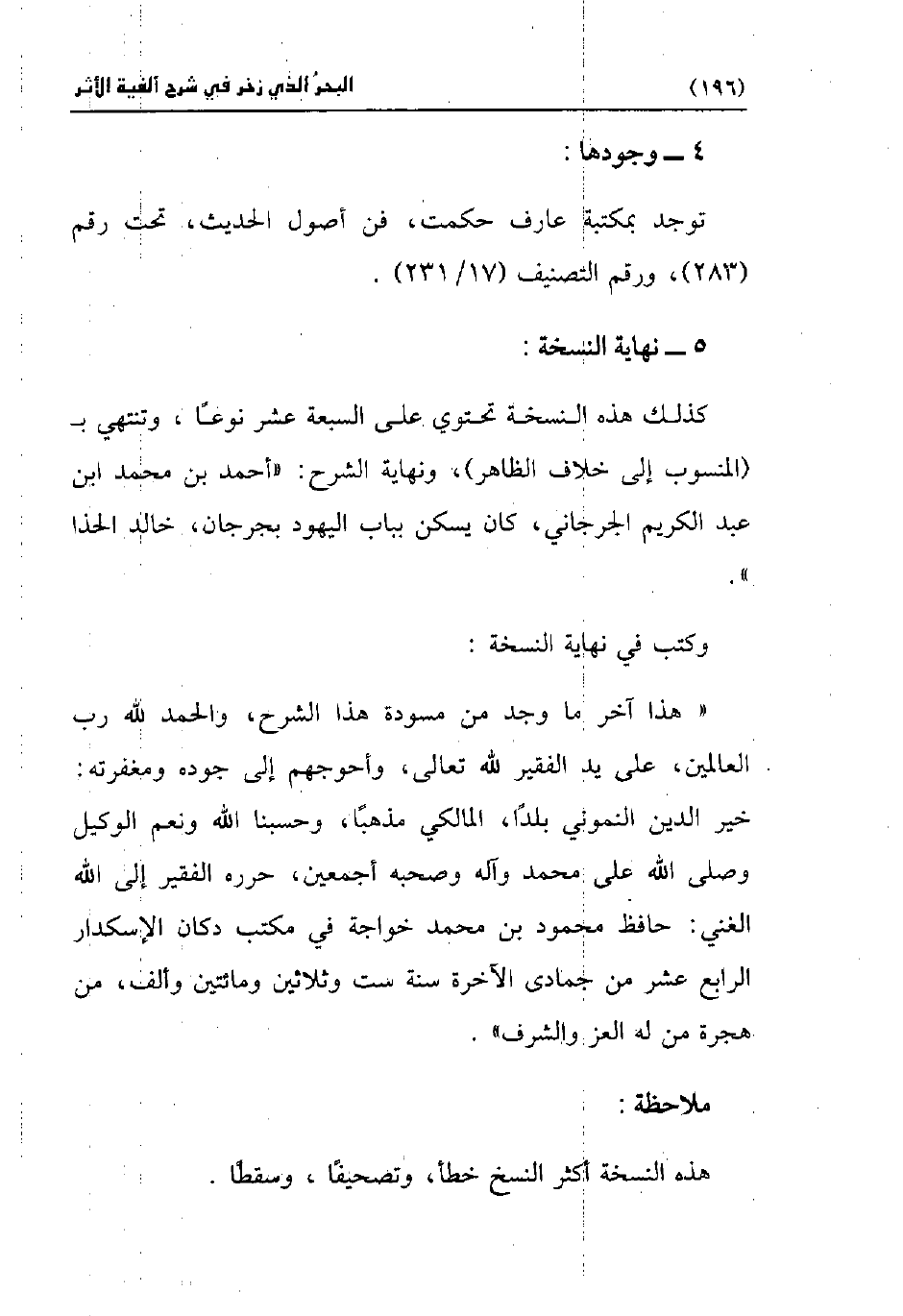 كذلك هذه النسخة تحتوي على السبعة عشر نوعًا، وتنتهي بـ (المنسوب إلى خلاف الظاهر)، ونهاية الشرح: "أحمد بن محمد ابن عبد الكريم الجرجاني، كان يسكن بباب اليهود بجرجان، خالد الحذا".