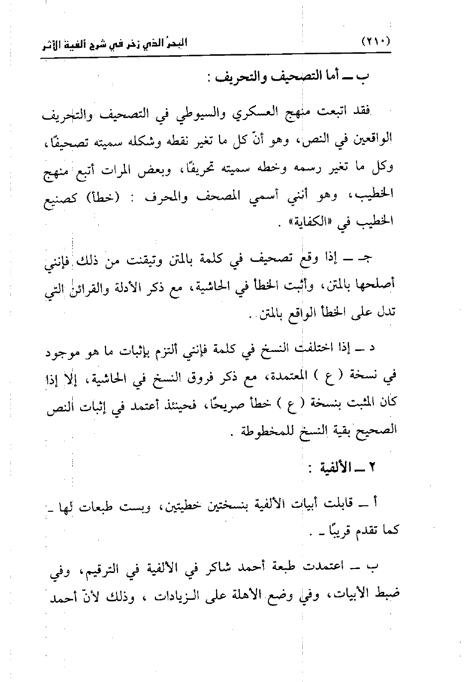 ب- اعتمدت طبعة أحمد شاكر في الألفية في الترقيم، وفي ضبط الأبيات، وفي وضع الأهلة على الزيادات، وذلك لأنّ أحمد