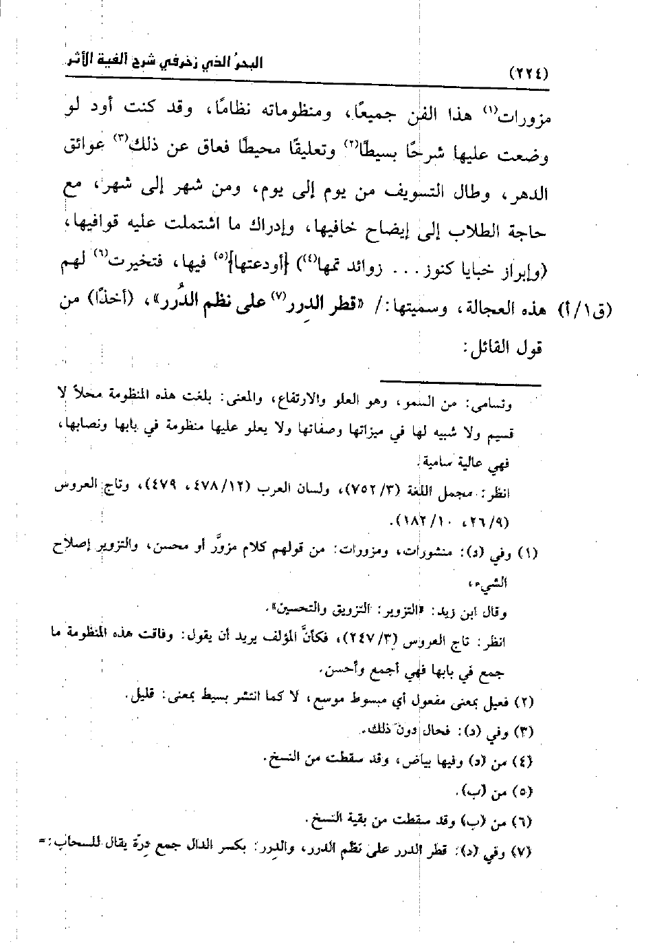 مزورات (¬1) هذا الفن جميعًا، ومنظوماته نظامًا، وقد كنت أود لو وضعت عليها شرحًا بسيطًا (¬2) وتعليقًا محيطًا فعاق عن ذلك (¬3) عوائق الدهر، وطال التسويف من يوم إلى يوم، ومن شهر إلى شهر، مع حاجة الطلاب إلى إيضاح خافيها، وإدراك ما اشتملت عليه قوافيها، (وإبراز خبايا كنوز. . . زوائد تمها) (¬4) [أودعتها] (¬5) فيها، فتخيرت (¬6) لهم هذه العجالة، وسميتها: "قطر الدِرر (¬7) على نظم الدُرر"، (أخذًا) من قول القائل: