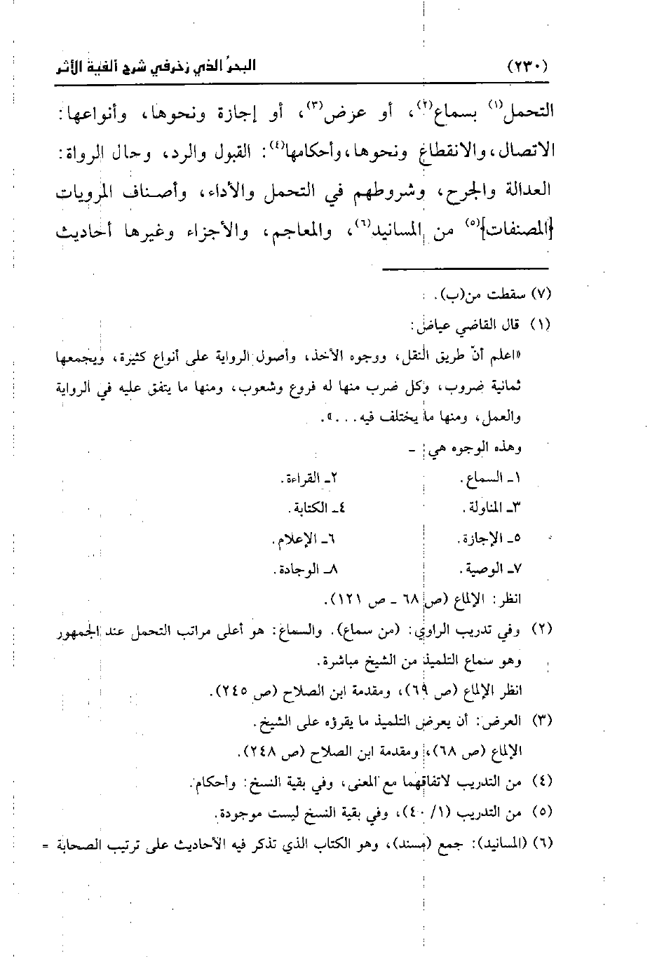"اعلم أنّ طريق النقل، ووجوه الأخذ، وأصول الرواية على أنواع كبيرة، ويجمعها ثمانية ضروب، وكل ضرب منها له فروع وشعوب، ومنها ما يتفق عليه في الرواية والعمل، ومنها ما يختلف فيه. . ".