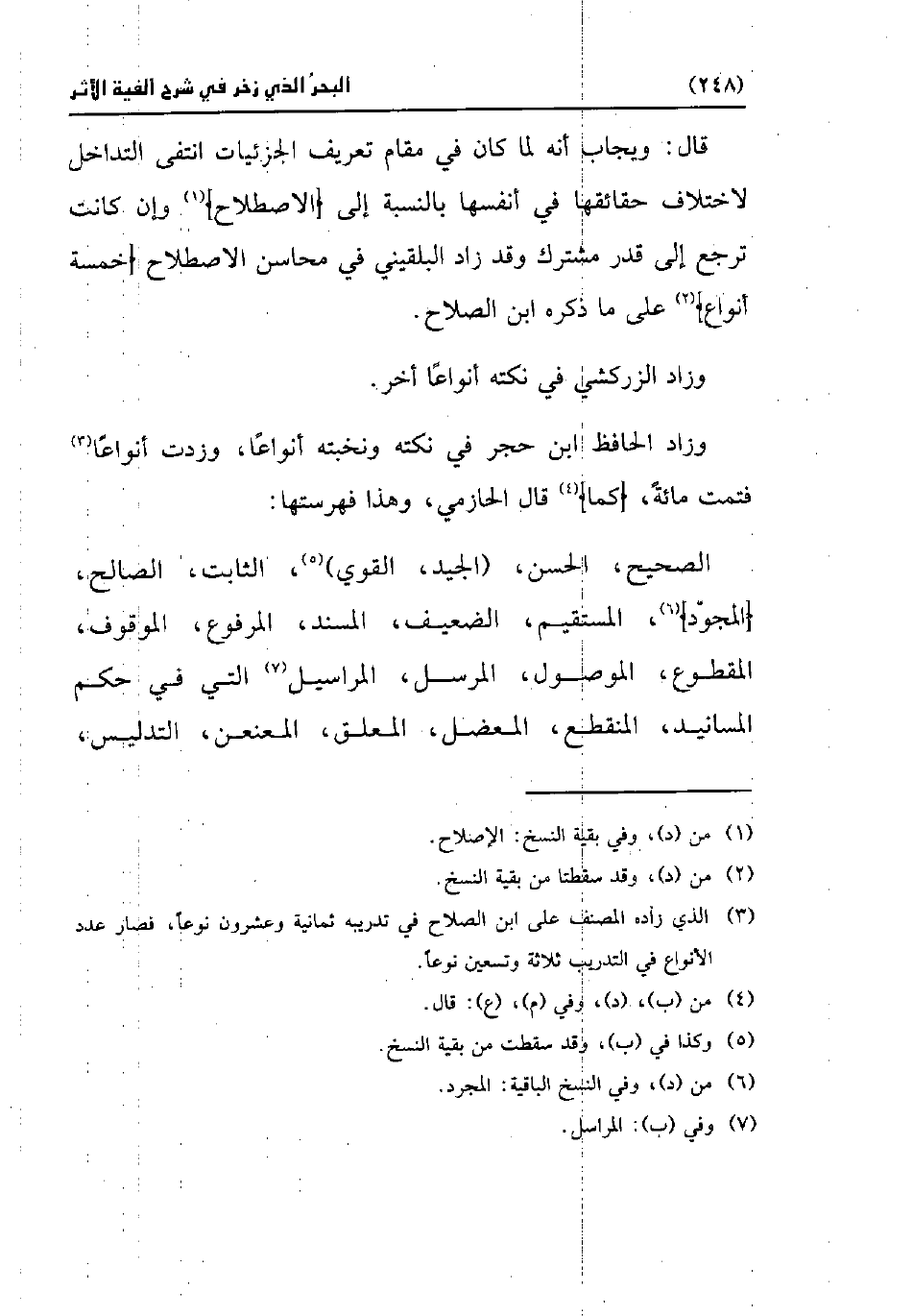 قال: ويجاب أنه لما كان في مقام تعريف الجزئيات انتفى التداخل لاختلاف حقائقها في أنفسها بالنسبة إلى [الاصطلاح] (¬1) وإن كانت ترجع إلى قدر مشترك وقد زاد البلقيني في محاسن الاصطلاح [خمس أنواع] (¬2) على ما ذكره ابن الصلاح.
