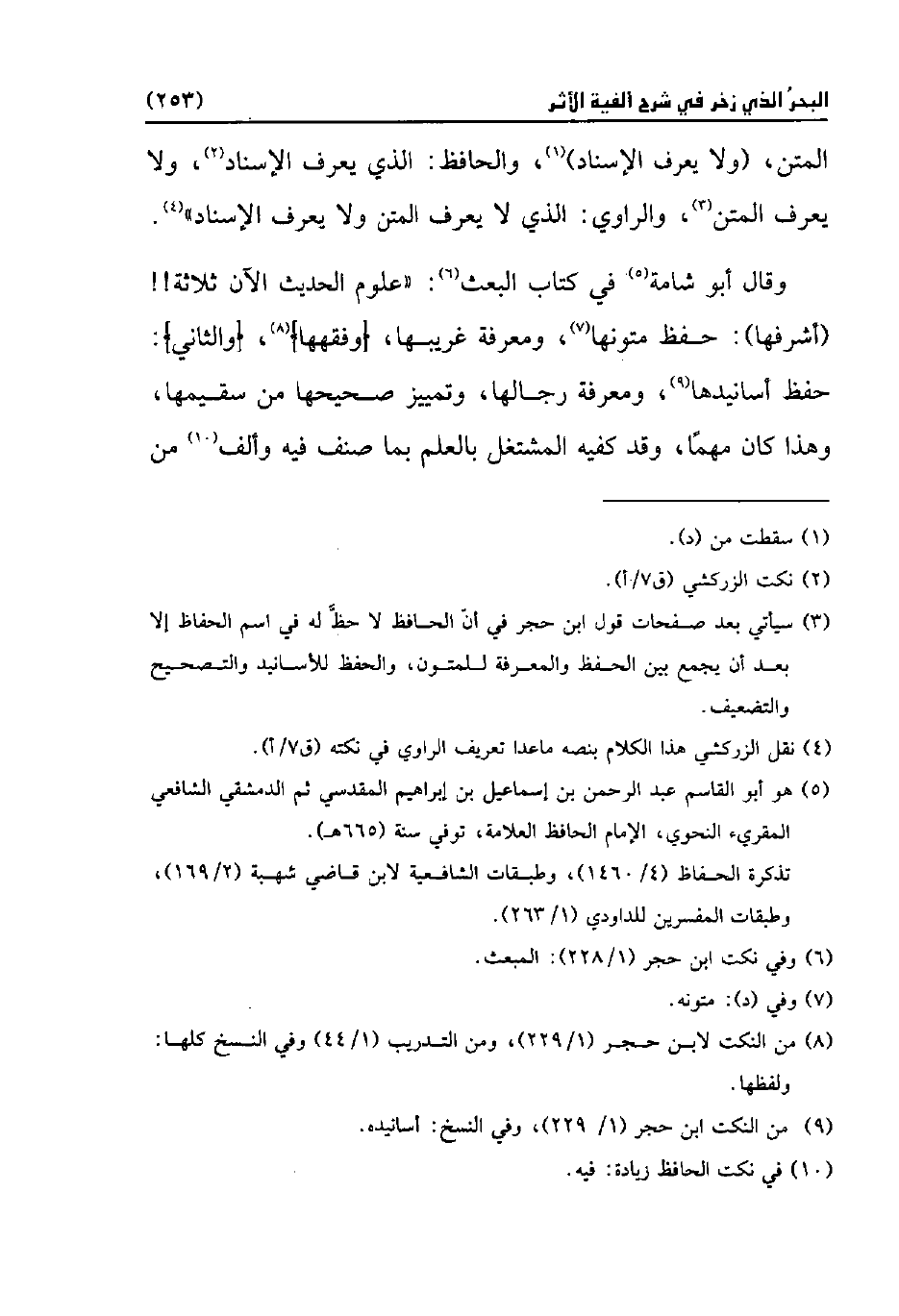 (¬3) سيأتي بعد صفحات قول ابن حجر في أنّ الحافظ لا حظَّ له في اسم الحفاظ إلَّا بعد أن يجمع بين الحفظ والمعرفة للمتون، والحفظ للأسانيد والتصحيح والتضعيف.