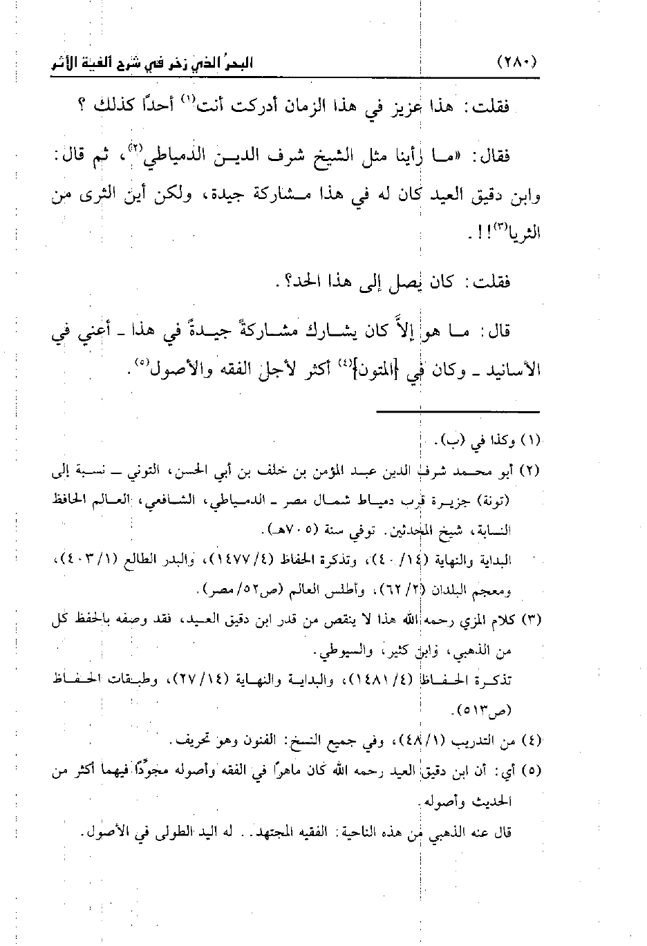 فقال: "ما رأينا مثل الشيخ شرف الدين الدمياطي (¬2)، ثم قال: وابن دقيق العيد كان له في هذا مشاركة جيدة، ولكن أين الثرى من الثريا (¬3)! ! .