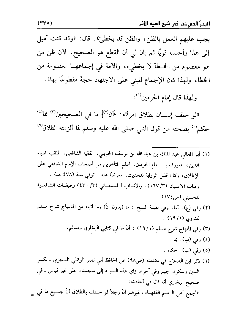 (¬1) أبو المعالي عبد الملك بن عبد اللَّه بن يوسف الجويني، الفقيه الشافعي، الملقب ضياء الدين، المعروف بـ: إمام الحرمين، أعلم المتأخرين من أصحاب الإمام الشافعي على الإطلاق، وكان قليل الرواية للحديث، معرضًا عنه. توفي سنة (478 هـ).