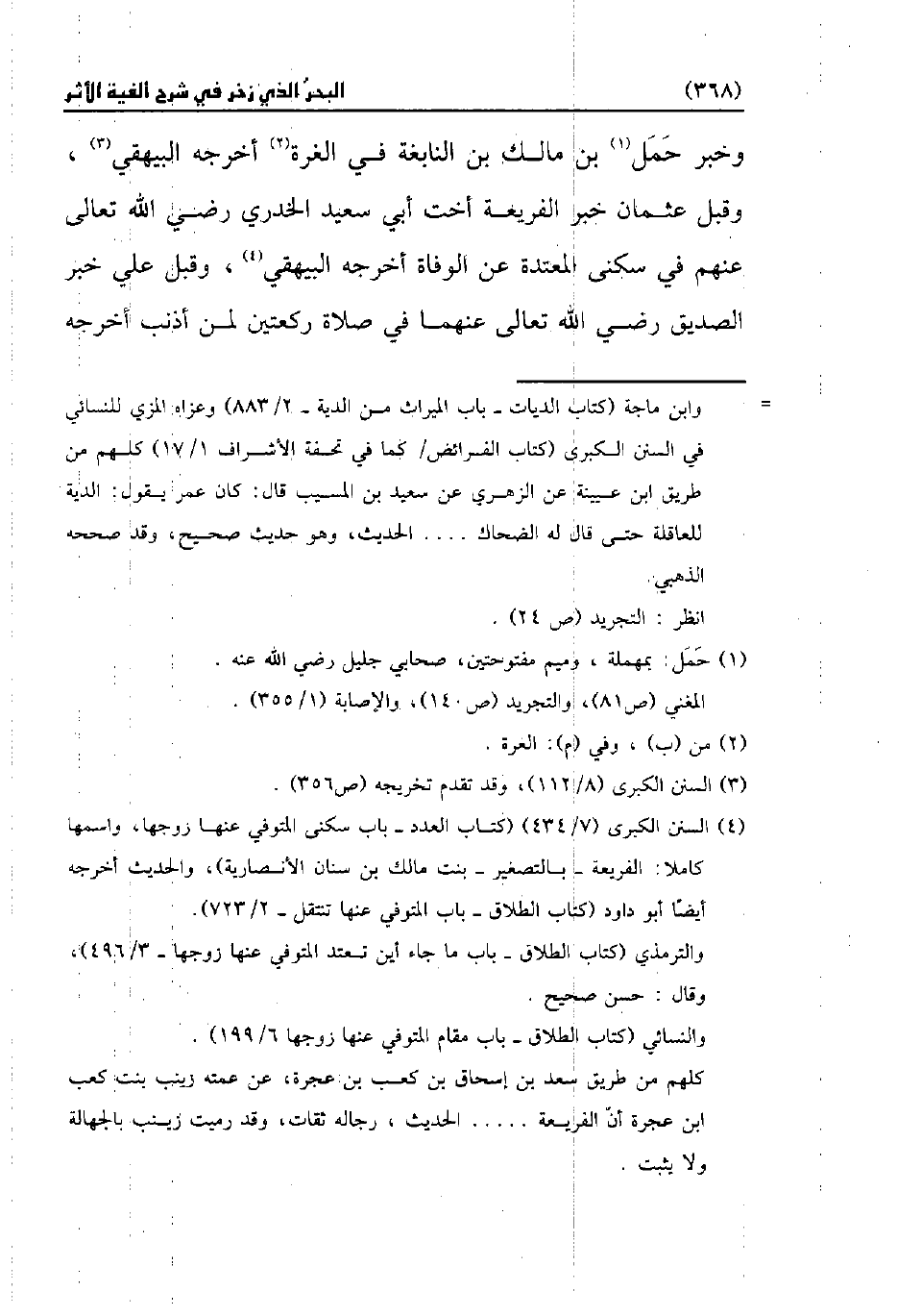 (¬4) السنن الكبرى (7/ 434) (كتاب العدد - باب سكنى المتوفي عنها زوجها، واسمها كاملا: الفريعة -بالتصغير- بن مالك بن سنان الأنصارية)، والحديث أخرجه أيضًا أبو داود (كتاب الطلاق - باب المتوفي عنها تنتقل - 2/ 723).
