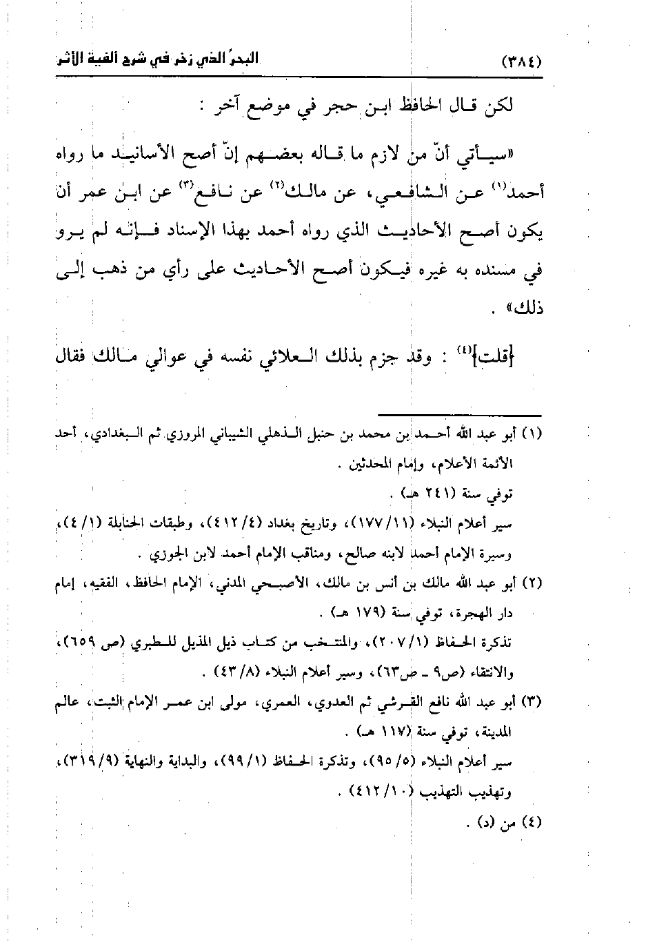 "سيأتي أنّ من لازم ما قاله بعضهم إنّ أصح الأسانيد ما رواه أحمد (¬1) عن الشافعي، عن مالك (¬2) عن نافع (¬3) عن ابن عمر أن يكون أصح الأحاديث الذي رواه أحمد بهذا الإسناد فإنَّه لم يرو في مسنده به غيره فيكون أصح الأحاديث على رأي من ذهب إلى ذلك".