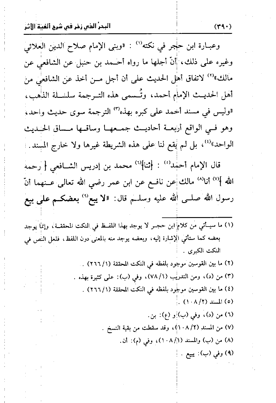 قال الإمام أحمد (¬5): [ثنا] (¬6) محمد بن إدريس الشافعي [رحمه اللَّه] (¬7) أنا (¬8) مالك عن نافع عن ابن عمر رضي اللَّه تعالى عنهما أنّ رسول اللَّه صلى اللَّه عليه وسلم قال: "لا يبع (¬9) بعضكم على بيع