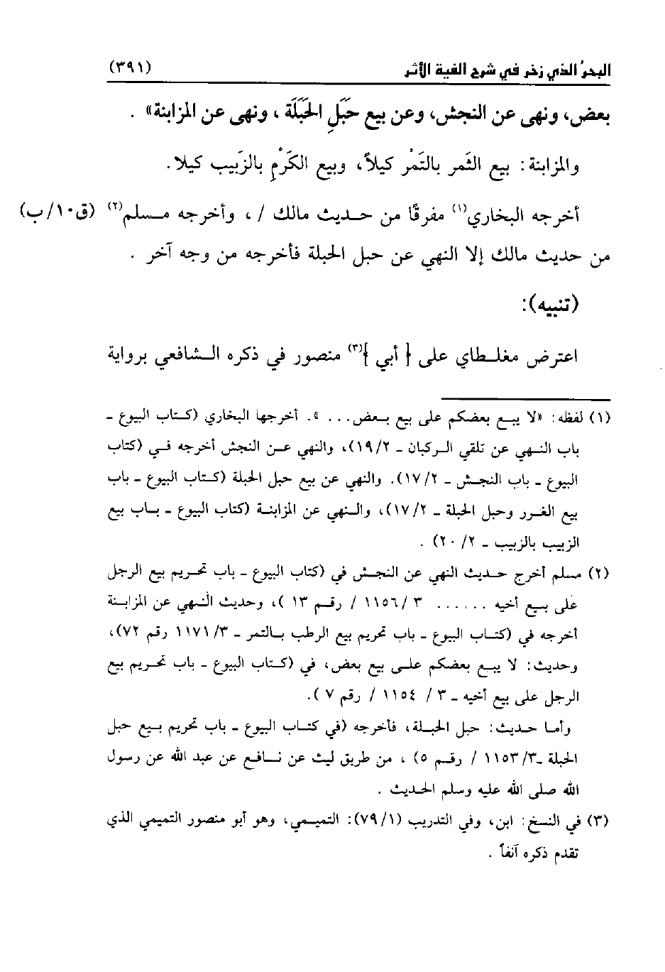 (¬1) لفظه: "لا يبيع بعضكم على بيع بعض. . . ". أخرجها البخاري (كتاب البيوع - باب النهي عن تلقي الركبان - 2/ 19)، والنهي عن النجش أخرجه في (كتاب البيوع - باب النجش - 2/ 17). والنهي عن بيع حبل الحبلة) كتاب البيوع - باب بيع الغرر وحبل الحبلة - 2/ 17)، والنهي عن المزابنة (كتاب البيوع - باب بيع الزبيب بالزبيب - 2/ 20).