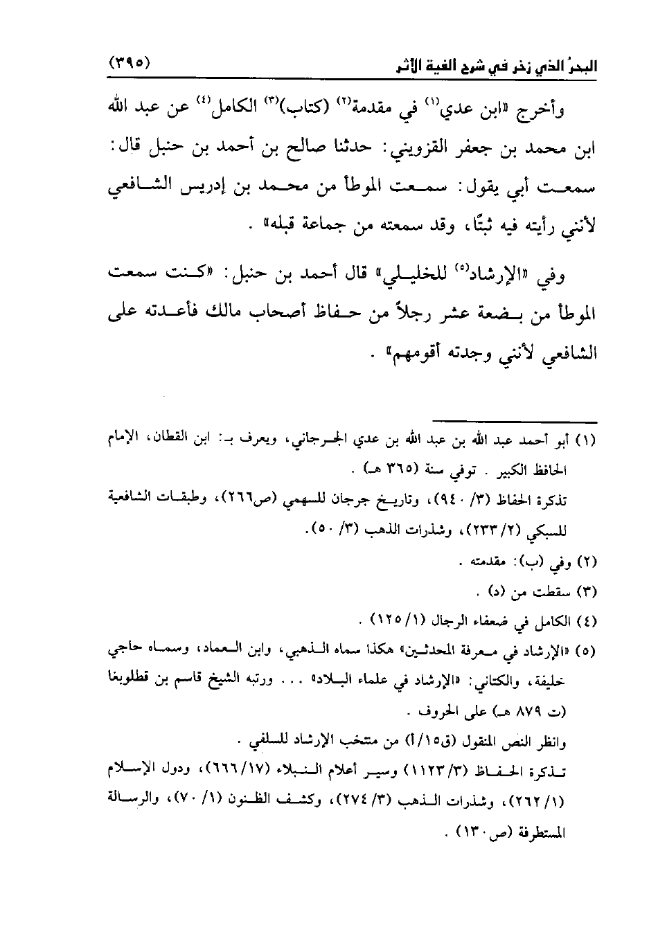 وأخرج "ابن عدي (¬1) في مقدمة (¬2) (كتاب) (¬3) الكامل (¬4) عن عبد اللَّه ابن محمد بن جعفر القزويني: حدثنا صالح بن أحمد بن حنبل قال: سمعت أبي يقول: سمعت الموطأ من محمد بن إدريس الشافعي لأنني رأيته فيه ثبتًا، وقد سمعته من جماعة قبله".