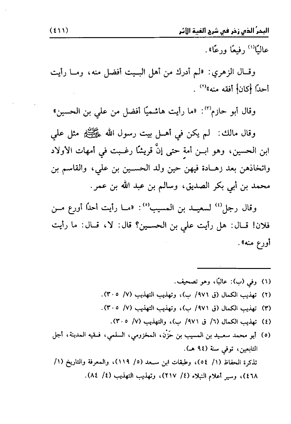 وقال مالك: لم يكن في أهل بيت رسول اللَّه -صلى اللَّه عليه وسلم- مثل علي ابن الحسين، وهو ابن أمةٍ حتى إنَّ قريشًا رغبت في أمهات الأولاد واتخاذهن بعد زهادة فيهن حين ولد الحسين بن علي، والقاسم بن محمد بن أبي بكر الصديق، وسالم بن عبد اللَّه بن عمر.