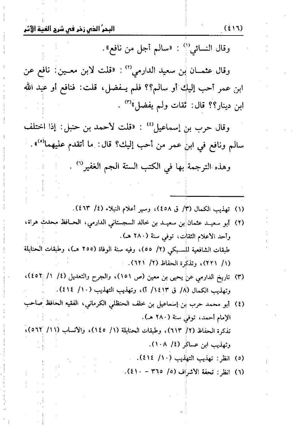 وقال حرب بن إسماعيل (¬4): "قلت لأحمد بن حنبل: إذا اختلف سالم ونافع في ابن عمر من أحب إليك؟ قال ما أتقدم عليهما (¬5) ".