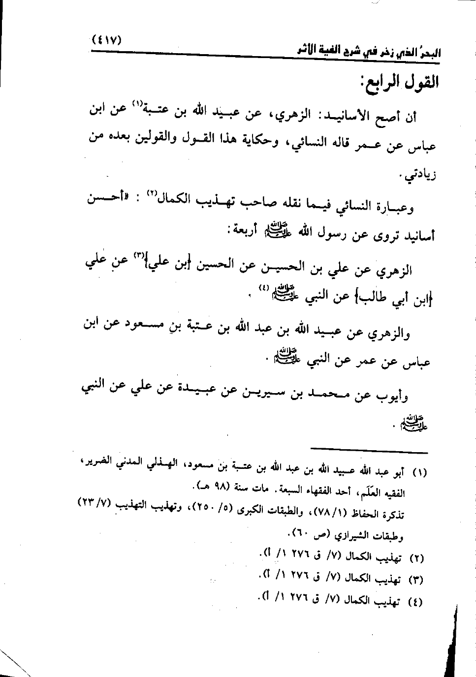 أن أصح الأسانيد: الزهري، عن عبيد اللَّه بن عتبة (¬1) عن ابن عباس عن عمر قاله النسائي، وحكاية هذا القول والقولين بعده من زيادتي.