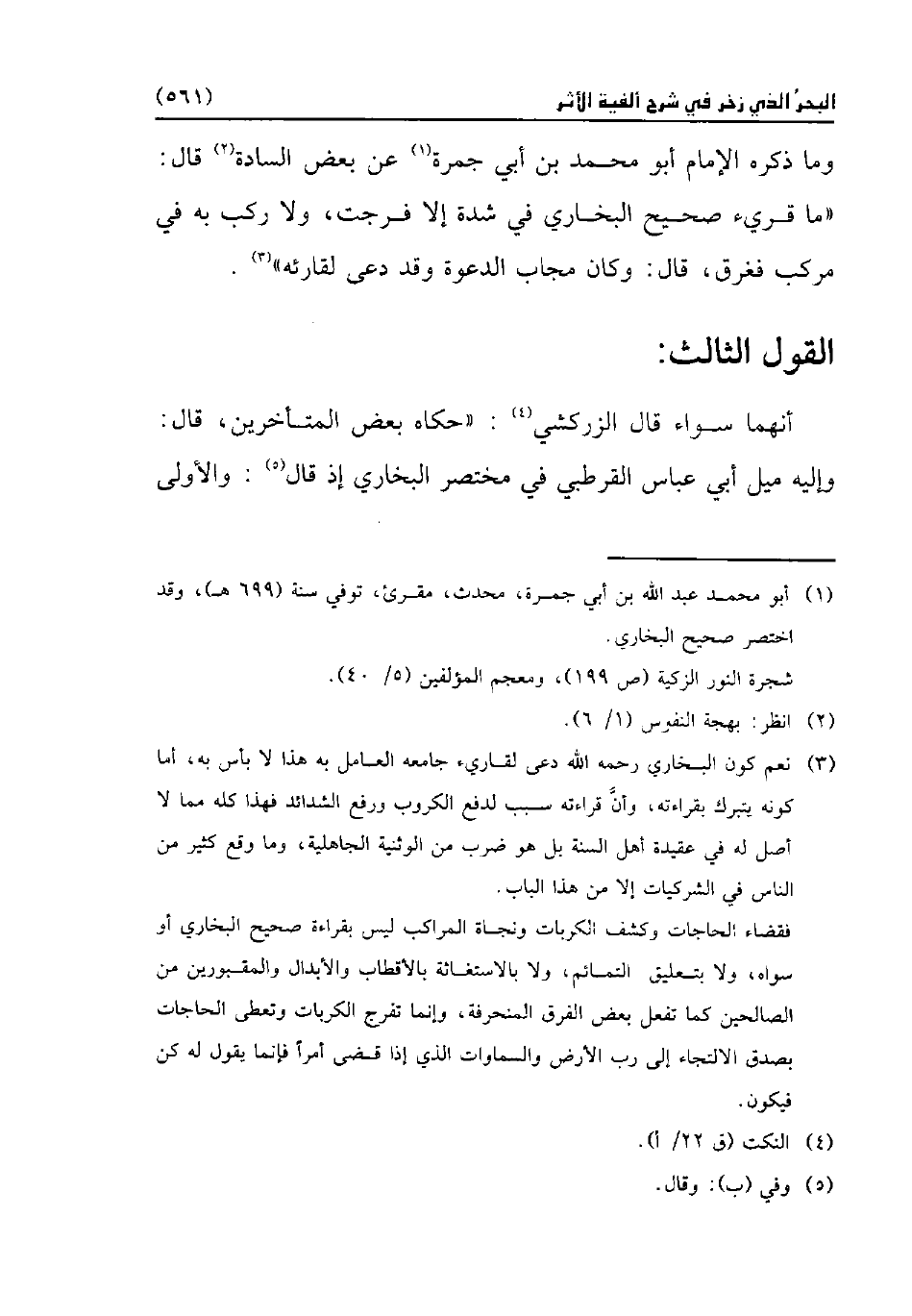 (¬3) نعم كون البخاري رحمه اللَّه دعى لقارئ جامعه العامل به هذا لا بأس به، أما كونه يتبرك بقراءته، وأن قراءته سبب لدفع الكروب ورفع الشدائد فهذا كله مما لا أص له في عقيدة أهل السنة بل هو ضرب من الوثنية الجاهية، وما وقع كثير من الناس في الشركات إلا من هذا الباب.