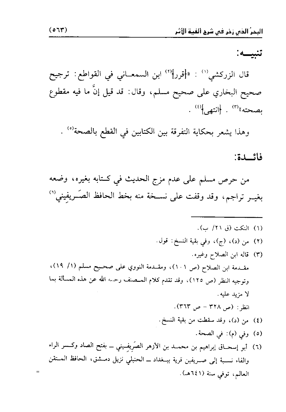 قال الزركشي (¬1): " [قرر] (¬2) ابن السمعاني في القواطع: ترجيح صحيح البخاري على صحيح مسلم، وقال: قد قيل إنَّ ما فيه مقطوع بصحته" (¬3). [انتهى] (¬4).