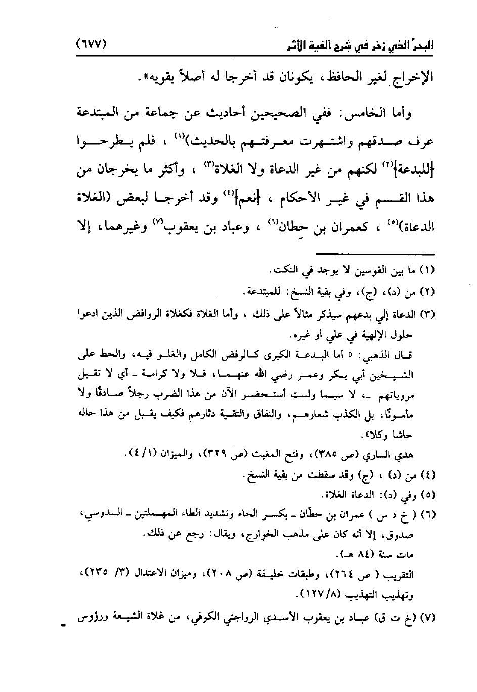وأما الخامس: ففي الصحيحين أحاديث عن جماعة من المبتدعة عرف صدقهم واشتهرت معرفتهم بالحديث) (¬1)، فلم يطرحوا [للبدعة] (¬2) لكنهم من غير الدعاة ولا الغلاة (¬3)، وأكثر ما يخرجان من هذا القسم في غير الأحكام، [نعم] (¬4) وقد أخرجا لبعض (الغلاة الدعاة) (¬5)، كعمران بن حِطان (¬6)، وعباد بن يعقوب (¬7) وغيرهما، إلا