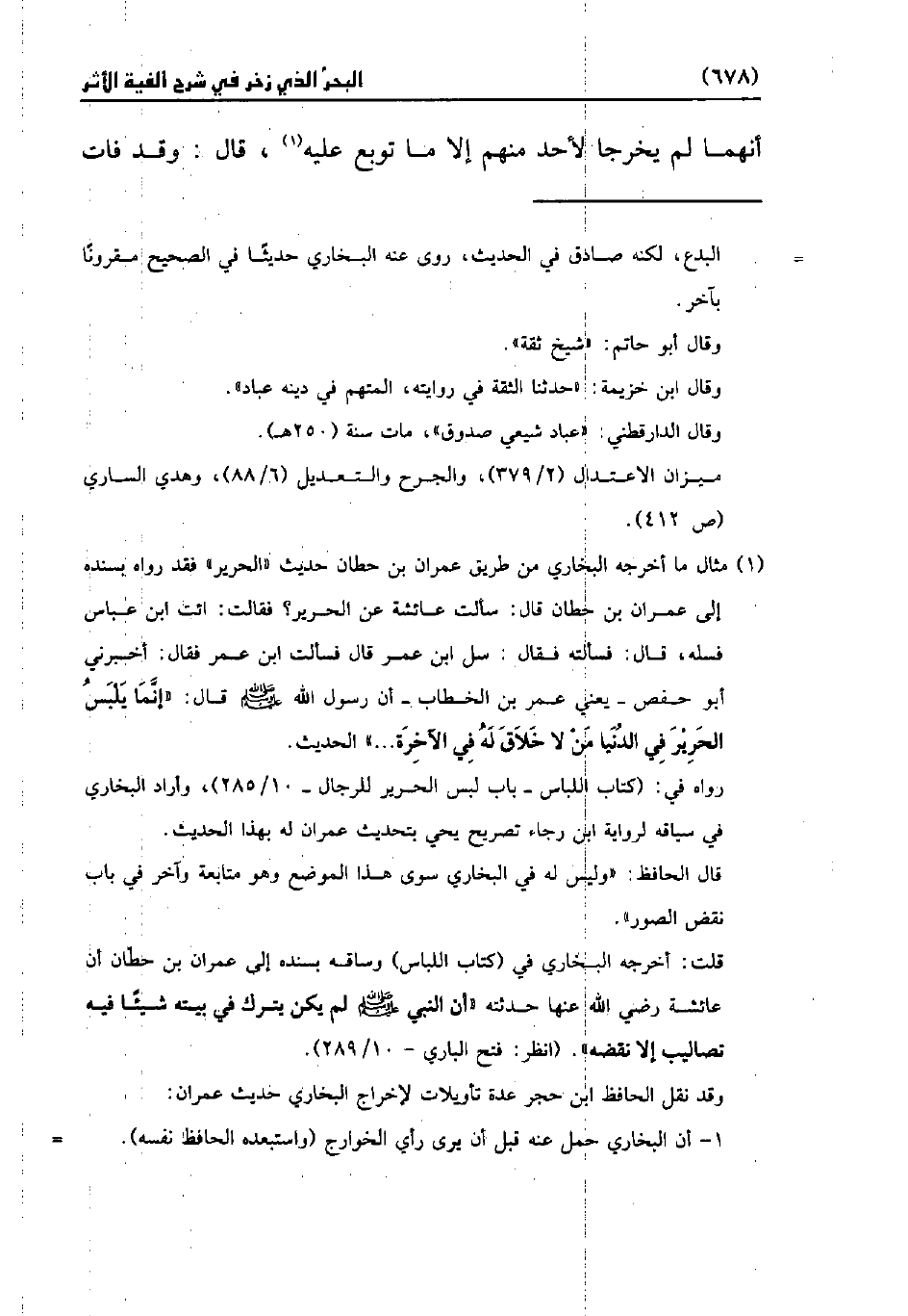 (¬1) مثال ما أخرجه البخاري من طريق عمران بن حطان حديث "الحرير" فقد رواه بسنده إلى عمران بن حطان قال: سألت عائشة عن الحرير؟ ففالت: ائت ابن عباس فسله، قال: فسألته فقال: سل ابن عمر قال قسألت ابن عمر فقال: أخبرني أبو حفص -يعني عمر بن الخطاب- أن رسول اللَّه -صلى اللَّه عليه وسلم- قال: "إنَّمَا يَلبَسُ الحَرِيْرَ فِي الدُنَيا مَنْ لا خَلَاقَ لَهُ فِي الآخِرَة. . ." الحديث.