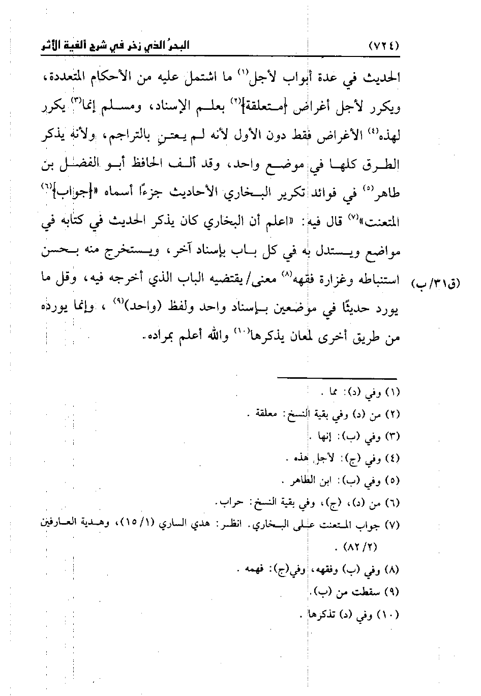 الحديث في عدة أبواب لأجل (¬1) ما اشتمل عليه من الأحكام المتعددة، ويكرر لأجل أغراض [متعلقة] (¬2) بعلم الإسناد، ومسلم إنما (¬3) يكرر لهذه (¬4) الأغراض فقط دون الأول لأنه لم يعتنِ بالتراجم، ولأنه يذكر الطرق كلها في موضع واحد، وقد ألف الحافظ أبو الفضل بن طاهر (¬5) في فوائد تكرير البخاري الأحاديث جزءًا أسماه " [جواب] (¬6) المتعنت" (¬7) قال فيه: "اعلم أن البخاري كان يذكر الحديث في كتابه في مواضع ويستدل به في كل باب بإسناد آخر، ويستخرج منه بحسن استنباطه وغزارة فقهه (¬8) معنى يقتضيه الباب الذي أخرجه فيه، وقل ما يورد حديثًا في موضعين بإسناد واحد ولفظ (واحد) (¬9)، وإنما يورده من طريق أخرى لمعان يذكرها (¬10) واللَّه أعلم بمراده.