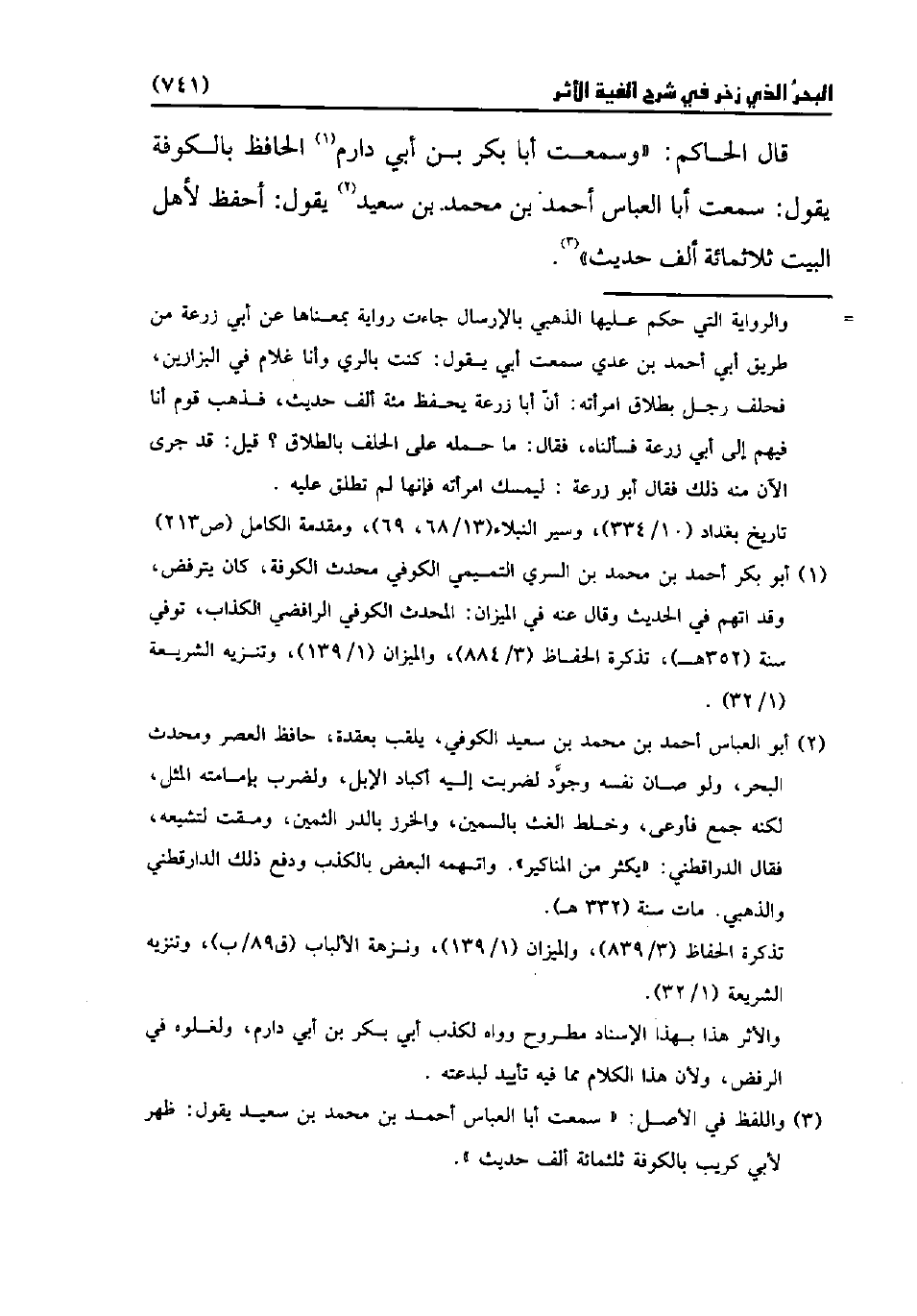 (¬1) أبو بكر أحمد بن محمد بن السري التميمي الكوفي محدث الكوفة، كان يترفض، وقد اتهم في الحديث وقال عنه في الميزان: المحدث الكوفي الرافضي الكذاب، توفي سنة (352 هـ)، تذكرة الحفاظ (3/ 884)، والميزان (1/ 139)، وتنزيه الشريعة (1/ 32).