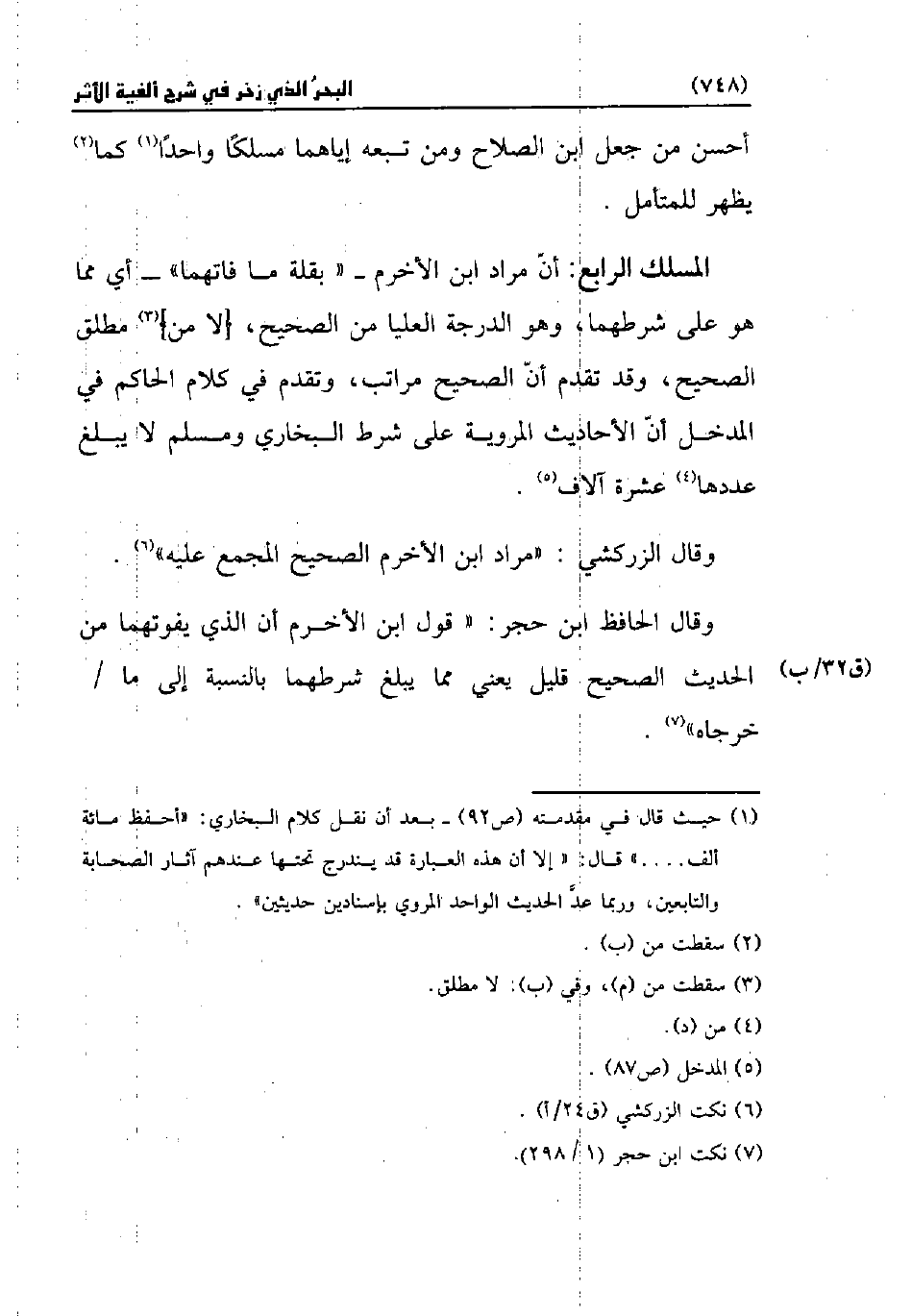 المسلك الرابع: أن مراد ابن الأخرم -"بقلة ما فاتهما"- أي مما هو على شرطهما، وهو الدرجة العليا من الصحيح، [لا من] (¬3) مطلق الصحيح، وقد تقدم أن الصحيح مراتب، وتقدم في كلام الحاكم في المدخل أنّ الأحاديث المروية على شرط البخاري ومسلم لا يبلغ عددها (¬4) عشرة آلاف (¬5).