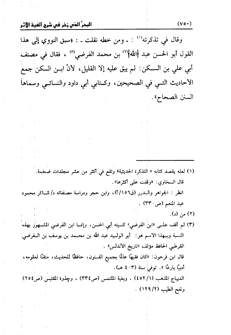 وقال في تذكرته (¬1): -ومن خطه نقلت-: "سبق النووي إلى هذا القبول أبو الحسن عبد [اللَّه] (¬2) بن محمد الفرضي (¬3)، فقال في مصنف أبي علي بن السكن: لم يبق عليه إلا القليل، لأن ابن السكن جمع الأحاديث التي في الصحيحين، وكتابي أبي داود والنسائي وسماها السنن الصحاح".