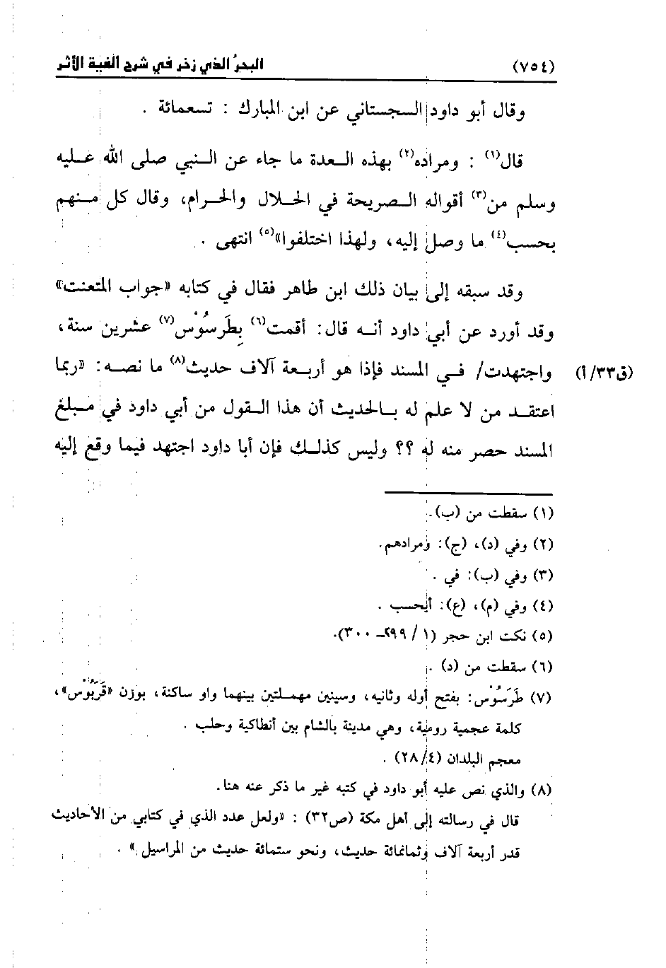 وقد سبقه إلى بيان ذلك ابن طاهر فقال في كتابه "جواب المتعنت" وقد أورد عن أبي داود أنه قال: أقمت (¬6) بِطَرْسُوس (¬7) عشرين سنة، واجتهدت في المسند فإذا هو أربعة آلاف حديث (¬8) ما نصه: "ربما اعتقد من لا علم له بالحديث أن هذا القول من أبي داود في مبلغ المسند حصر منه له؟ ؟ وليس كذلك فإن أبا داود اجتهد فيما وقع إليه