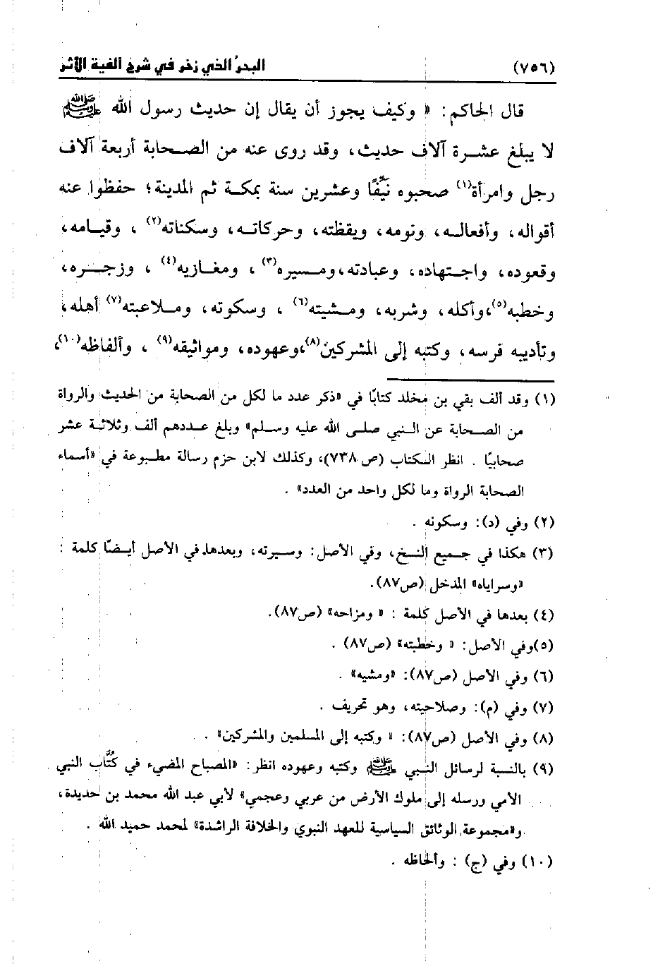 قال الحاكم: "وكيف يجوز أن يقال إن حديث رسول اللَّه -صلى اللَّه عليه وسلم- لا يبلغ عشرة آلاف حديث، وقد روى عنه من الصحابة أربعة آلاف رجل وامرأة (¬1) صحبوه نَيِّفًا وعشرين سنة بمكة ثم المدينة؛ حفظوا عنه أقواله، وأفعاله، ونومه، ويقظته، وحركاته، وسكناته (¬2)، وقيامه، وقعوده، واجتهاده، وعبادته، ومسيره (¬3)، ومغازيه (¬4)، وزجره، وخطبه (¬5)، وأ كله، وشربه، ومشيته (¬6)، وسكوته، وملاعبته (¬7) أهله، وتأديبه فرسه، وكتبه إلى المشركين (¬8)، وعهوده، ومواثيقه (¬9)، وألفاظه (¬10)،