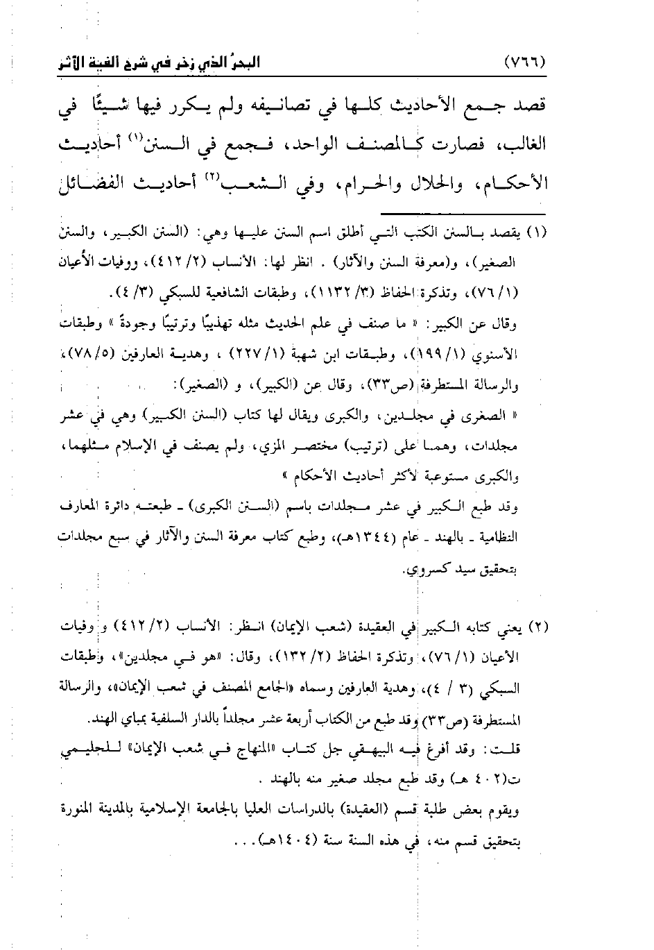 (¬2) يعني كتابه الكبير في العقيدة (شعب الإيمان) انظر: الأنساب (2/ 412) ووفيات الأعيان (1/ 76)، وتذكرة الحفاظ (2/ 132)، وقال: "هو في مجلدين"، وطبقات السبكي (3/ 4) وهدية العارفين وسماه "الجامع المصنف في شعب الإيمان"، والرسالة المستطرفة (ص 33) وقد طبع من الكتاب أربعة عشر مجلدًا بالدار السلفية بمباي الهند.