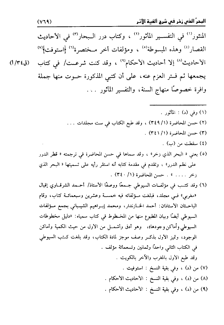 (¬5) يعني "البحر الذي زخر"، وقد سماها في حسن المحاضرة في ترجمته "قطر الدرر على نظم الدرر"، وتقدم في مقدمة كتابه، أنه استقر على تسميتها "البحر الذي زخر .. . ". حسن المحاضرة (1/ 340).